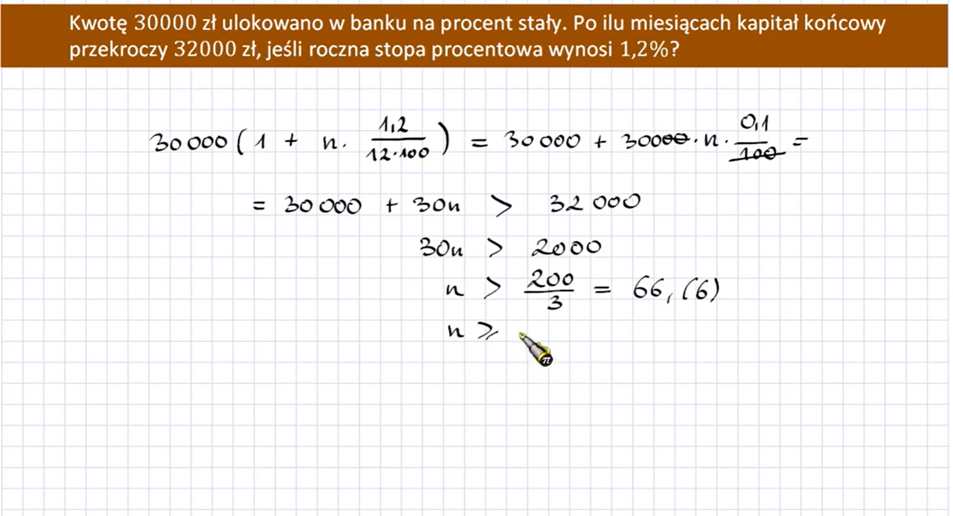 Odsetki stanowią wpłaconej kwoty, są więc równe , a zarazem wynoszą .