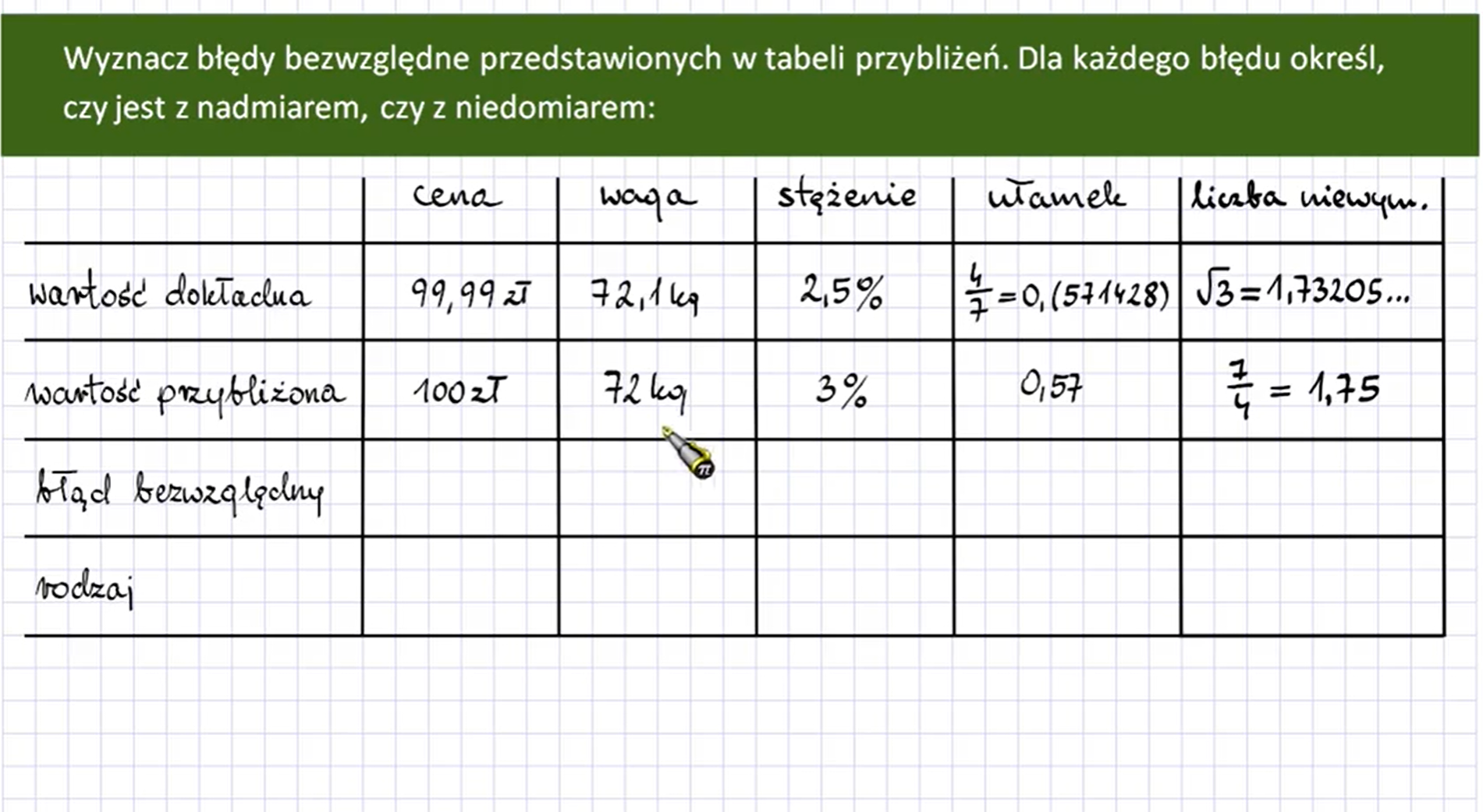 Przypomnijmy, że błąd bezwzględny jest wyrażany w takich samych jednostkach jak wartość, którą przybliżamy.