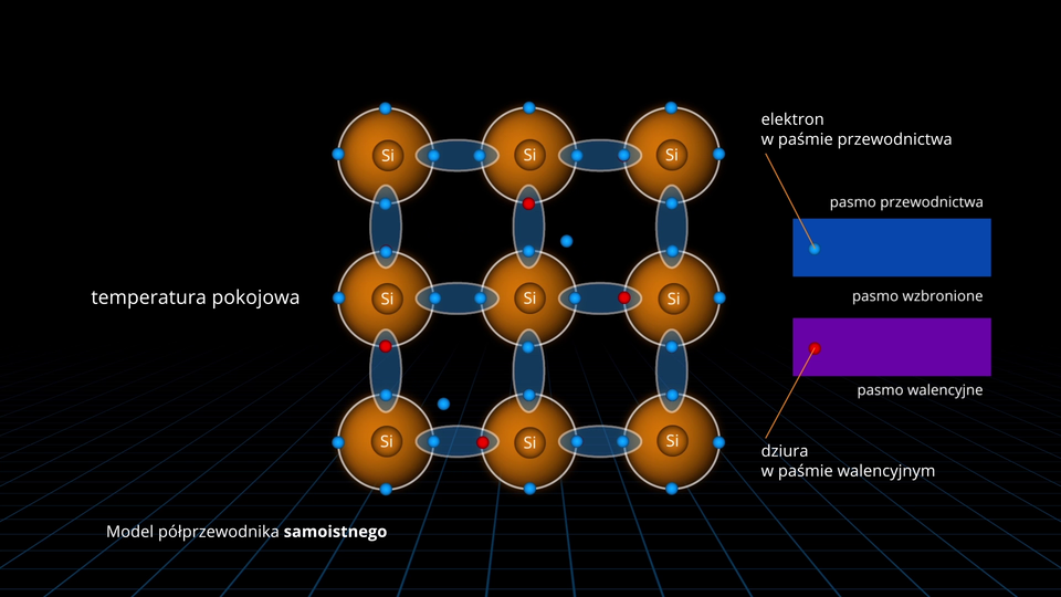 Poniższa animacja pokazuje schemat wiązań w typowym półprzewodniku - krzemie oraz ilustruje powstawanie swobodnych elektronów i dziur w półprzewodnikach i ich chaotyczny ruch.