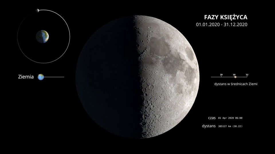 Animacja pokazuje ruch Księżyca wokół Ziemi. Ze względu na jego oświetlenie przez Słońce w różnych położeniach orbity widzimy inny fragment tarczy Księżyca. Obejrzyj animację, analizując dokładnie każdy etap tego ruchu.