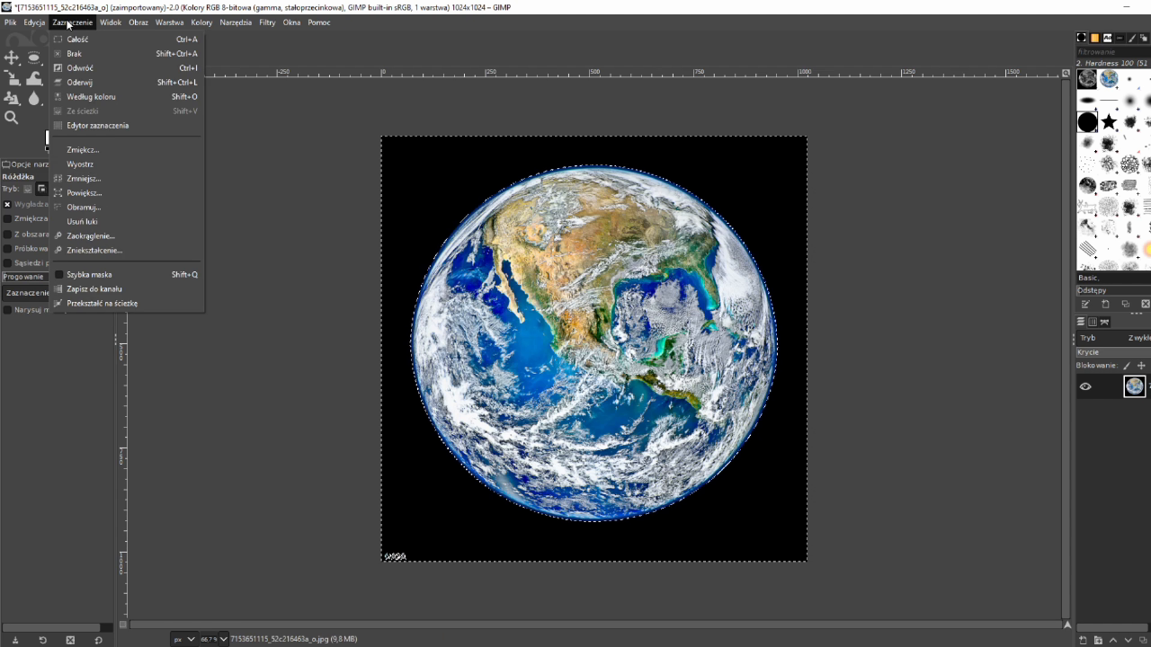 Widzimy jednak, że zamiast Ziemi zaznaczone jest teraz tło, musimy więc odwrócić zaznaczenie. W tym celu z paska poleceń wybieramy Zaznaczenie, a następnie polecenie Odwróć (skrót klawiszowy Ctrl+ I lub z głównego menu Zaznaczenie | Odwróć).