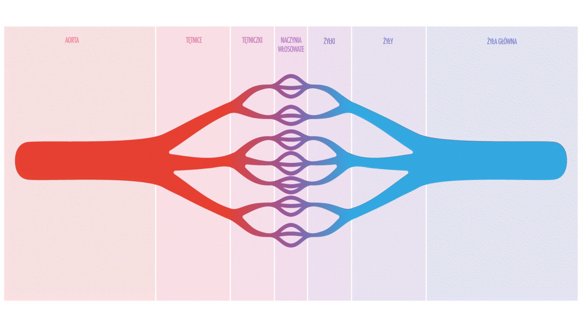 Wykres przedstawia szybkość przepływu krwi. W zależności od rodzaju naczynia i stanu ogólnego organizmu człowieka, krew przepływa z różną prędkością. Ilustruje to fioletowa krzywa. Szybkość przepływu krwi została zmierzona w centymetrach na sekundę. Krew w aorcie płynie z prędkością pięćdziesięciu centymetrów na sekundę. Przez naczynia o większej średnicy i wyższej elastyczności krew przepływa szybciej. Do tych naczyń krwionośnych zaliczamy: aortę i tętnice. Ich średnica mierzona jest w milimetrach. Średnica aorty to dwadzieścia pięć milimetrów, a tętnic cztery milimetry. Przez tętniczki o wysokiej elastyczności i średnicy liczonej w mikrometrach krew przepływa już wolniej. Przez naczynia o małej średnicy, liczonej w mikrometrach, takich naczynia włosowate czy żyłki, o niskiej elastyczności, krew przepływa bardzo wolno. Średnica naczynia włosowatego to jeden mikrometr, a żyłki dwa mikrometry. Przez żyły i żyłę główną o niskiej elastyczności, ale większej średnicy, liczonej w milimetrach krew płynie szybciej. Średnica żyły to pięć milimetrów, a żyły głównej trzydzieści milimetrów. Przez żyłę główną krew płynie z połową szybkości wyjściowej, dwudziestu pięciu centymetrów na sekundę.
