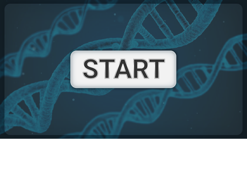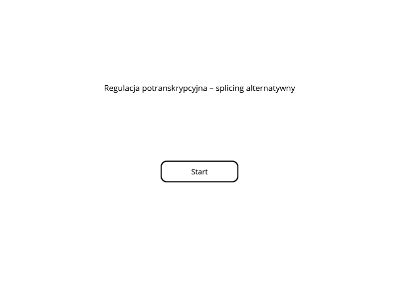 Symulacja interaktywna przedstawia regulację potranskrypcyjną – alternatywny splicing. Po kliknięciu na prostokątne pole z napisem „Start” ukazuje się podwójna helisa DNA składająca się z dwóch skręconych wokół jednej osi linii połączonych ze sobą równoległymi do siebie odcinkami komplementarnych zasad azotowych. Nad nicią DNA widnieje napis „Kliknij, aby rozpocząć transkrypcję”. Pod spodem znajduje się prostokątne pole z napisem „Transkrypcja”. Po kliknięciu na to pole przez każdy skręt w łańcuchu DNA przesuwa się owalny kształt z napisem „polimeraza DNA”, a na dole pojawia się pojedyncza nić z rozkompletowanymi zasadami azotowymi w postaci pojedynczych odcinków, podpisana jako „pre‑mRNA”. Nić ta staje się coraz dłuższa, gdy owalny kształt z napisem „polimeraza DNA” przesuwa się coraz dalej wzdłuż łańcucha. Kolejno pojawia się plansza z napisem „Wybierz rodzaj splicingu” z dwoma prostokątnymi polami „Klasyczny” i „Alternatywny”. Po kliknięciu na pole z napisem „Klasyczny” pojawia się pojedynczy łańcuch pre‑mRNA z wyznaczonymi pięcioma intronami oraz czterema eksonami w różnych kolorach i poleceniem „Wytnij introny i połącz eksony”. Wszystkie introny należy kliknąć, aby je wyciąć (brak możliwości kliknięcia eksonów). Po wycięciu intronów eksony przysuwają się do siebie i się łączą. Pojawia się podpis „mRNA”. Pod spodem znajduje się prostokątne pole z napisem: „Translacja”. Po kliknięciu na nie pojawia się układ przylegających do siebie czterech kolorowych kwadratów i prostokątów, które symbolizują domeny białka oraz napis „Białko gotowe!”. Po kliknięciu na pole z napisem „Alternatywny” widoczny jest pojedynczy łańcuch pre‑mRNA z wyznaczonymi odcinkami (pięcioma intronami i czterema eksonami). Zarówno introny, jak i eksony można kliknąć, aby je usunąć. Należy usunąć wszystkie introny i jeden lub dwa eksony. Po dokonaniu tej czynności pojawia się prostokątne pole z napisem: „Translacja”. Po kliknięciu na nie pojawia się układ przylegających do siebie dwóch lub trzech kolorowych kwadratów i prostokątów oraz napis „Białko gotowe!”.