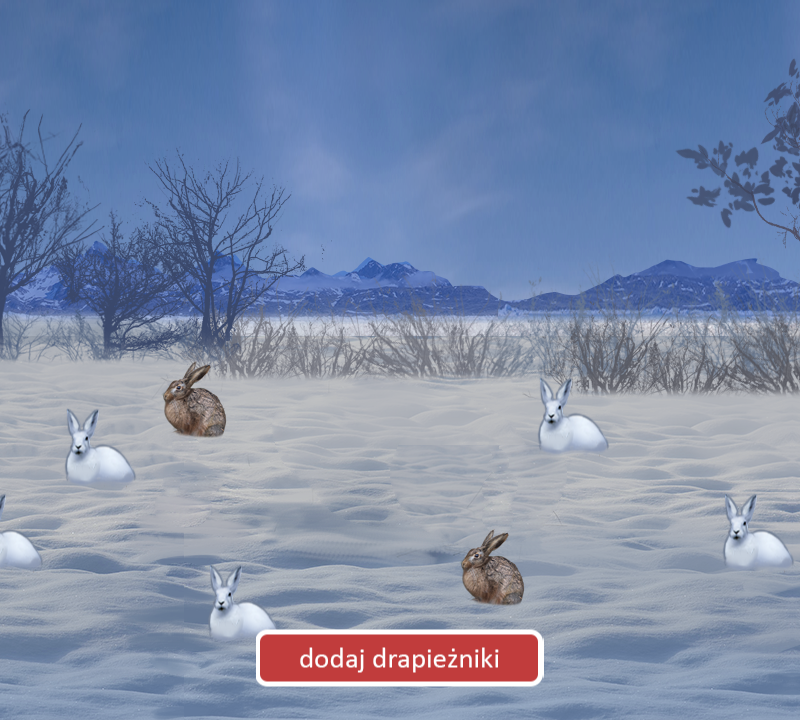 Populacja zajęcy zamieszkuje obszary tundrowe. Niektóre osobniki mają białą barwę futra, inne – brązową. Przeprowadź symulację interaktywną obrazującą szanse przeżycia zajęcy w zależności od ich umaszczenia.