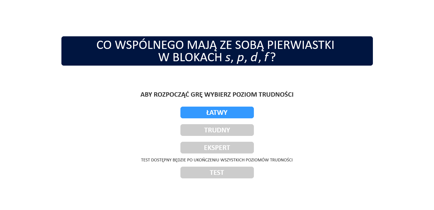 Czy wiesz, że konfiguracja elektronowa ma wpływ na kształt obecnego układu okresowego pierwiastków? Rozwiąż quiz sprawdzający – zanim zaczniesz, przygotuj układ okresowy, który jest dostępny poniżej. Gra składa się z trzech poziomów z limitem czasowym. Aby przejść do następnego etapu, najpierw musisz rozwiązać poprzedni. Powodzenia!