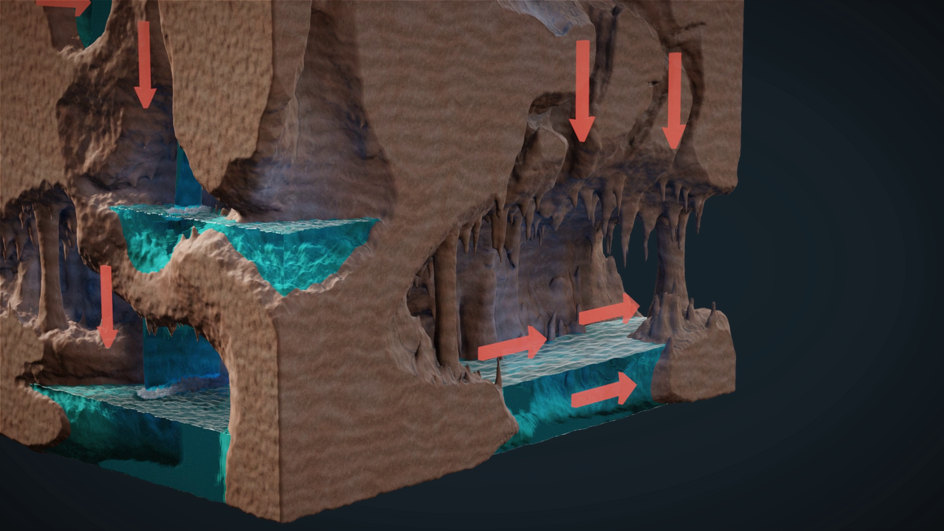 Natrafiając na warstwy skał różniących się odpornością, wody podziemne przestają infiltrować, a zaczynają formować podziemne strumienie. Płynące podziemne potoki wypłukują warstwy skał i odpowiadają za powstawanie chodników i korytarzy jaskiniowych. W miejscach szczególnie spękanych z czasem powstają jaskinie oraz groty.