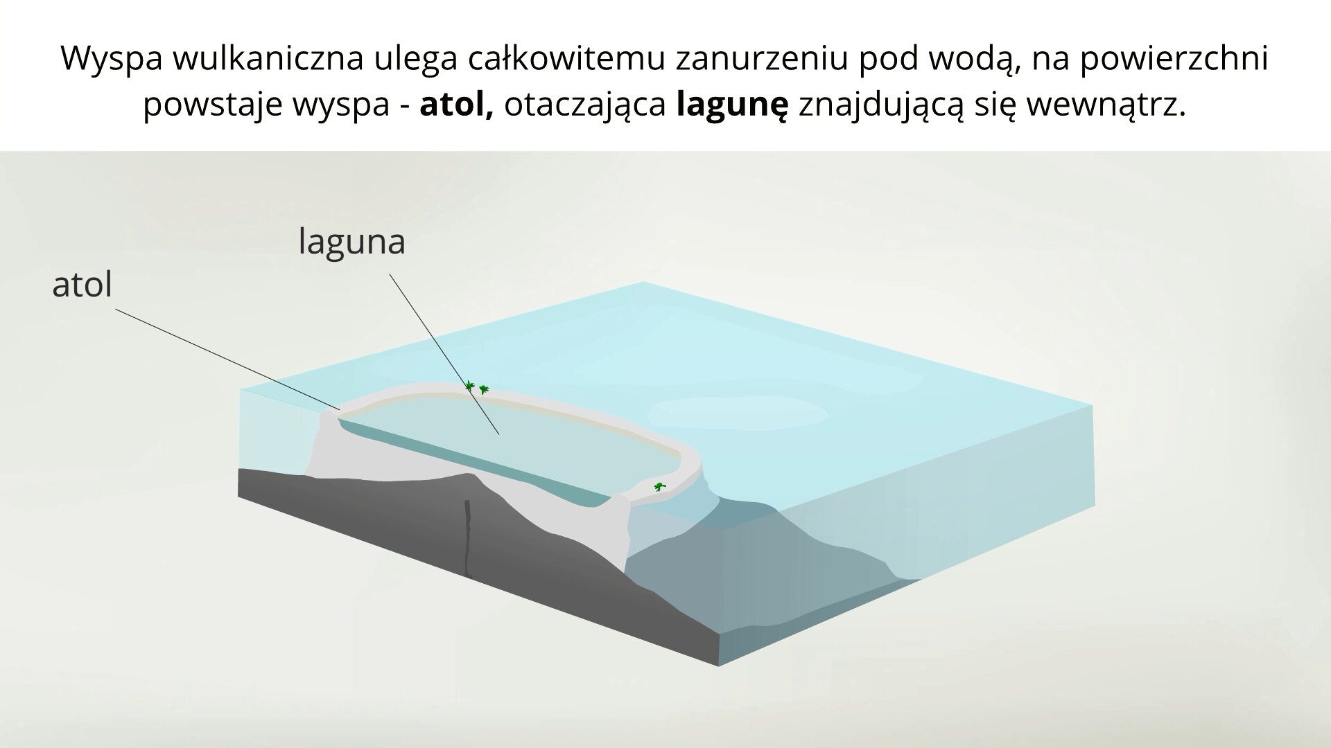 Animacja przedstawia widok wyspy wulkanicznej, na której zaczynają wokół osadzać się koralowce, tworząc rafę. Wyspa wulkaniczna ulega niszczeniu oraz zapadaniu się pod wpływem ciężaru rafy. Wyspa wulkaniczna ulega całkowitemu zanurzeniu pod wodą. Na powierzchni pozostaje wyspa – atol, otaczająca lagunę znajdującą się wewnątrz.