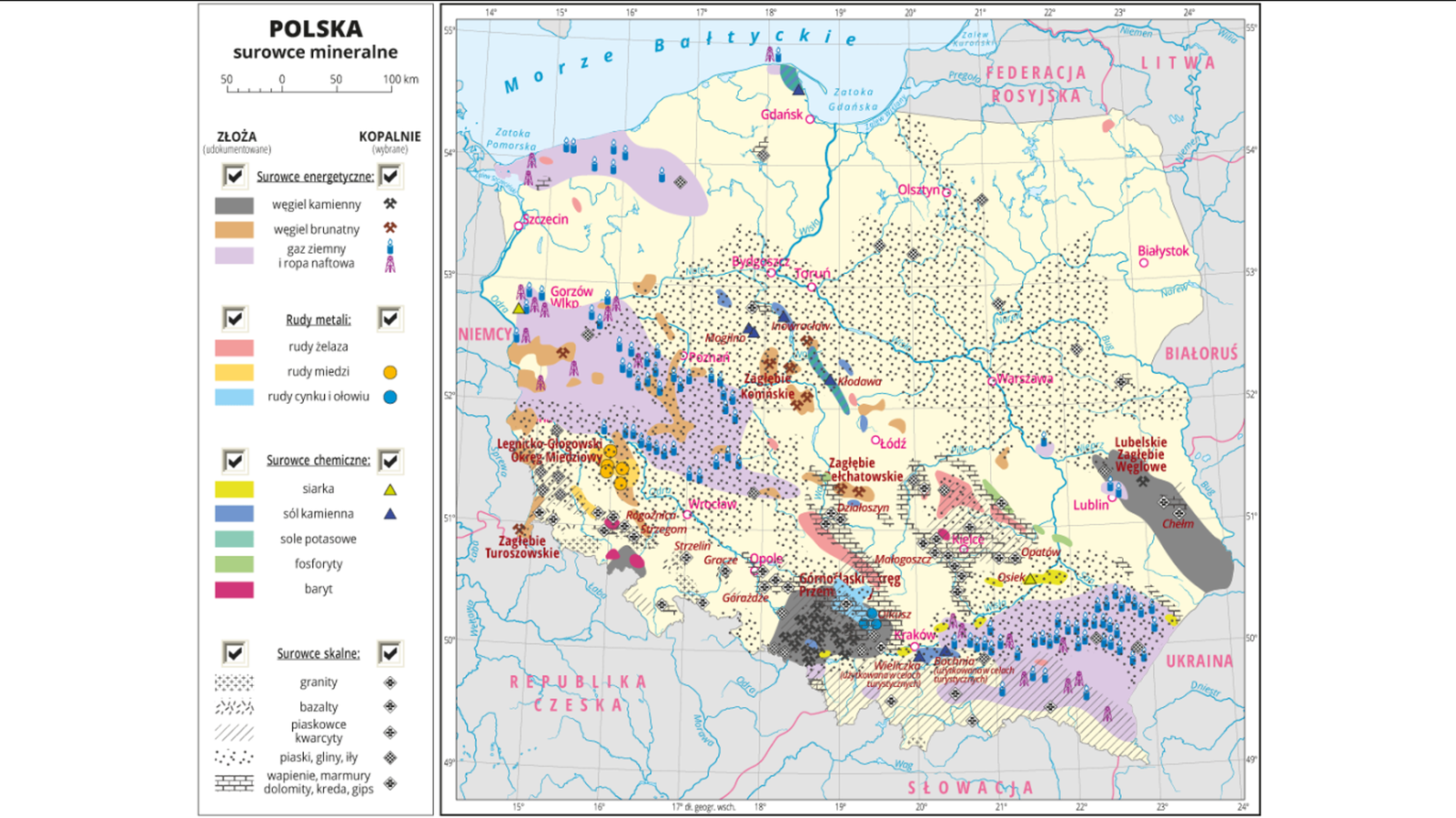 Ilustracja przedstawia mapę Polski. Oznaczono i opisano główne miasta. Na mapie kolorami przedstawiono złoża surowców energetycznych, rud metali, surowców chemicznych i surowców skalnych, a za pomocą sygnatur przedstawiono miejsca wydobycia poszczególnych surowców. Każdy rodzaj surowców przedstawiony jest na innej warstwie, które można dowolnie wyłączać. Opisano nazwy okręgów przemysłowych: Górnośląski Okręg Przemysłowy, Legnicko‑Głogowski Okręg Miedziowy, Zagłębie Bełchatowskie, Zagłębie Konińskie, Zagłębie Turoszowskie, Lubelskie Zagłębie Węglowe. Na poszczególnych warstwach informacyjnych przedstawiono: warstwa pierwsza – surowce energetyczne: węgiel kamienny, węgiel brunatny, gaz ziemny i ropa naftowa; warstwa druga – rudy metali: rudy żelaza, rudy miedzi, rudy cynku i ołowiu; warstwa trzecia – surowce chemiczne: siarka, sól kamienna, sole potasowe, fosforyty, baryt. warstwa czwarta – surowce skalne: granity, bazalty, piaskowce, piaski, gliny, iły, wapienie marmury, dolomity, kreda, gips. Występowanie i wydobycie większości surowców skupione jest w południowej oraz zachodniej części Polski. W środkowej części Polski przeważają złoża surowców skalnych, głównie piasku. Po lewej stronie mapy w legendzie opisano znaki użyte na mapie.