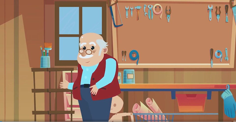 Animacja opowiada o przemianie drewnianego pajaca w żywego chłopca. Na planszy animacji widać warsztat stolarski, narzędzia (młotki, obcęgi, piły, taśmy), starszego mężczyznę chodzącego po warsztacie, a także drewnianego pajacyka.