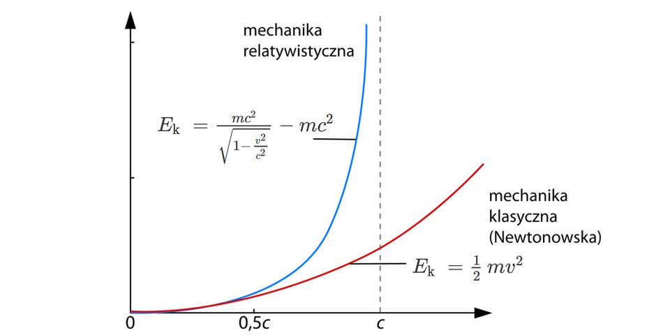 Akceleratory, takie jak Wielki Zderzacz Hadronów w CERN, umożliwiają rozpędzenie cząstek do prędkości bliskich prędkości światła. Przeanalizuj wykres zależności energii kinetycznej cząstki od jej prędkości i oceń prawdziwość poniższych zdań.