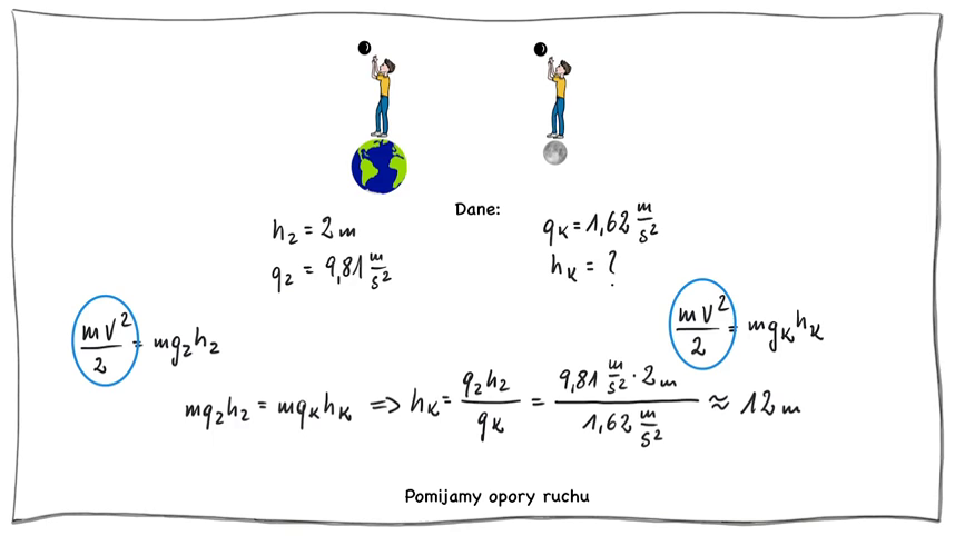 Obejrzyj samouczek, w którym obliczono, na jaką wysokość wzniesie się ciało wyrzucone pionowo do góry na Księżycu, jeśli na Ziemi wzniosło się ono na wysokość 2 m. Wykonaj polecenia.