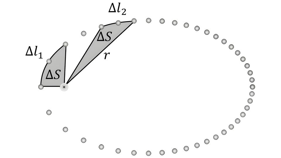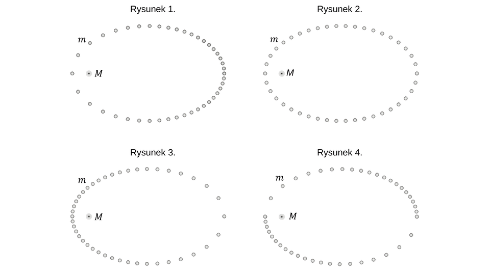 Ciało niebieskie o masie krąży po wydłużonej orbicie eliptycznej dookoła innego ciała niebieskiego o masie . Środek masy układu przypada praktycznie w środku . Ten ruch zilustrowano na rysunku: przedstawiono położenia ciała w kolejnych chwilach, między którymi upływał ustalony odstęp czasu. Na jednym spośród rysunków 1.-4. prawidłowo zilustrowano opisany ruch.
