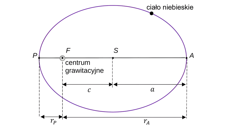 - jedno z ognisk elipsy. S - środek elipsy. - punkt orbity leżący najbliżej centrum grawitacyjnego. - punkt orbity leżący najdalej od centrum grawitacyjnego. lub SA - wielka półoś elipsy. Relacje między długościami odcinków: