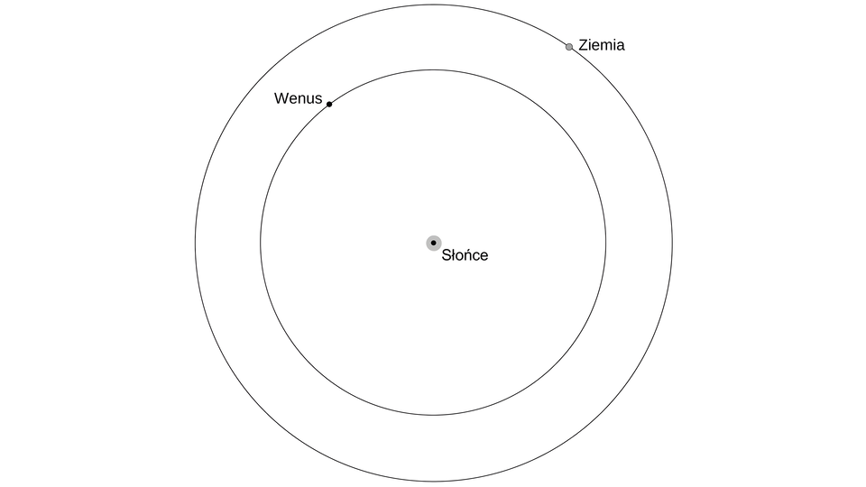 Wenus i Ziemia obiegają Słońce po orbitach, które z dobrym przybliżeniem możemy uznać za kołowe. Na poniższym rysunku przedstawiono położenie względne orbit obu planet z zachowaniem skali pomiędzy rozmiarami tych orbit. Przyjmij do obliczeń, że okres obiegu Ziemi dookoła Słońca wynosi rok, a każda z planet oddziałuje tylko ze Słońcem.