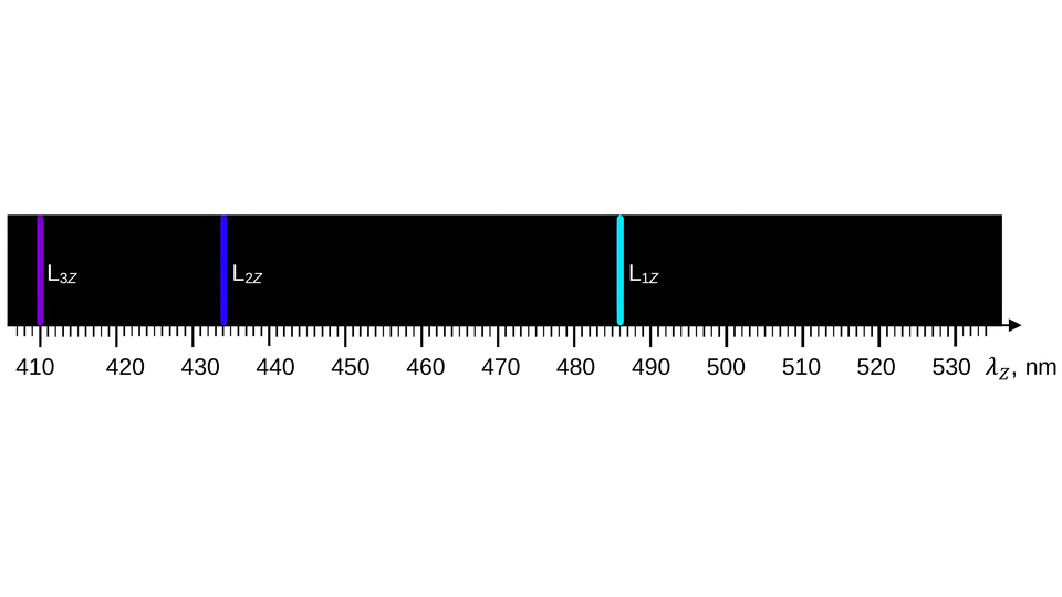 Naukowcy przypuszczają, że zarejestrowane promieniowanie jest emitowane przez wzbudzone atomy wodoru. Fragment widma promieniowania wodoru, zarejestrowanego w układzie odniesienia, w którym próbka wodoru spoczywa, jest przedstawiony na rysunku 2. Długości fal linii widmowych na rysunku 1. są wprost proporcjonalne do tych na rysunku 2. Odpowiadające sobie linie widmowe oznaczono: ; ; i .