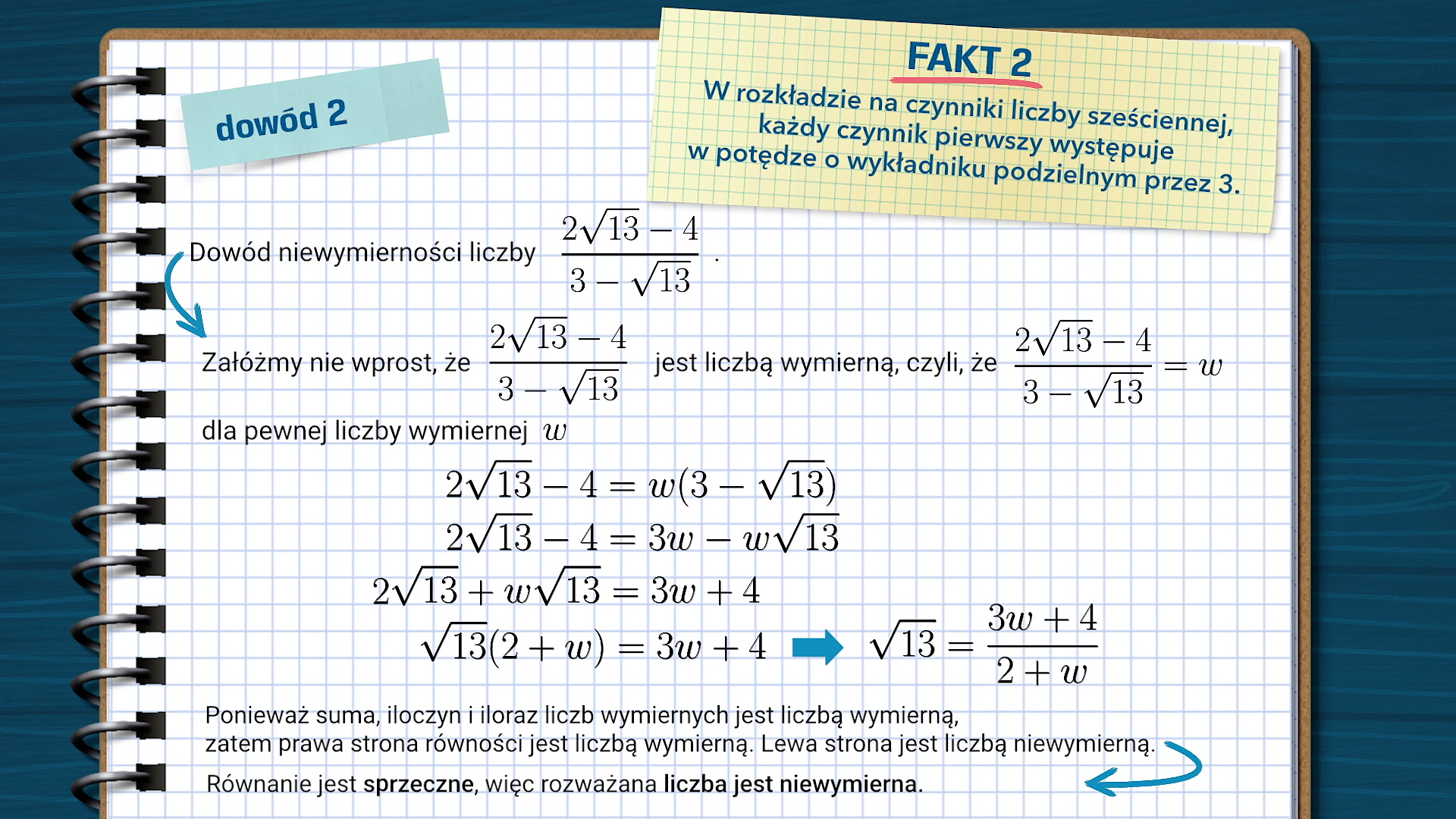 Aby równość była prawdziwa, prawa strona też musi dzielić się przez . Ponieważ prawa strona jest pełnym kwadratem, więc dzieli się przez . Wynika stąd, że lewa strona również dzieli się przez , czyli dzieli . Zatem dzieli . Okazuje się, że zarówno jaki i są podzielne przez , co jest sprzeczne z założeniem, że ułamek jest nieskracalny. Do sprzeczności doprowadziło nas założenie, że jest liczbą wymierną.