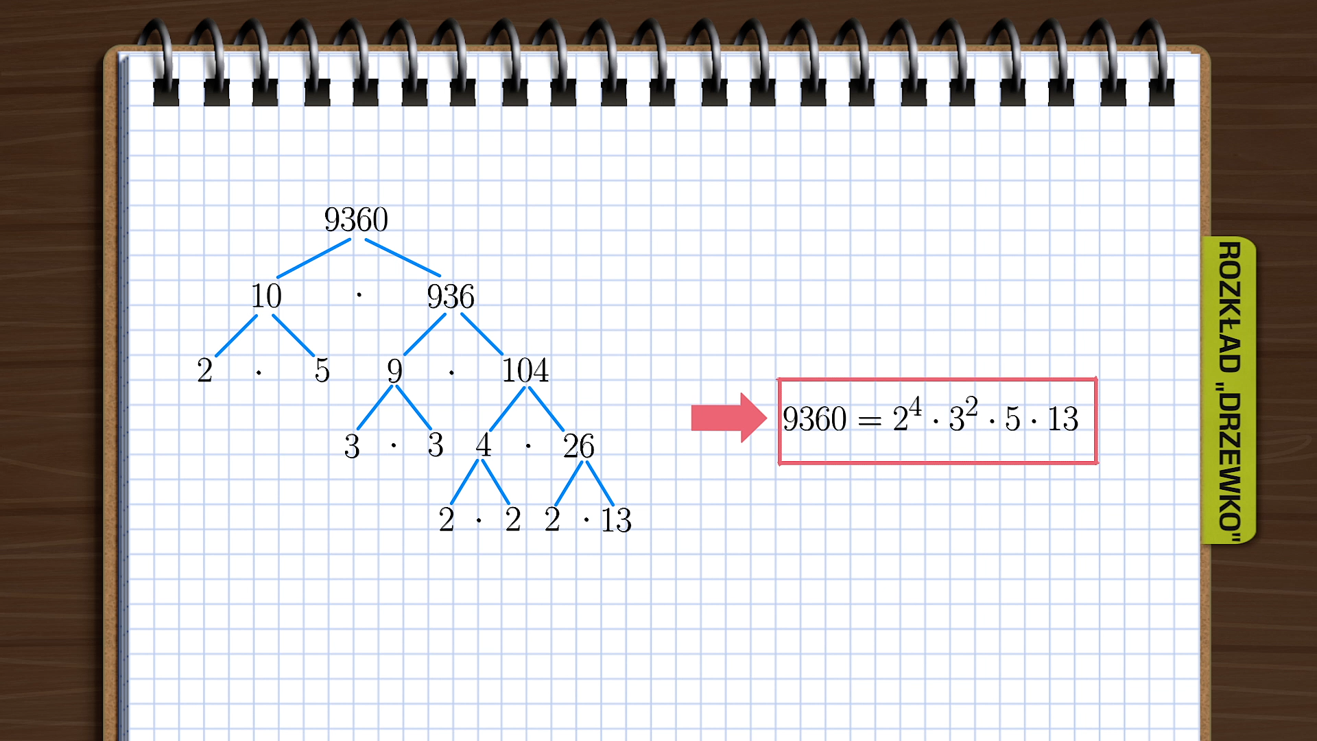Na ilustracji przedstawiono dwa pionowe rzędy liczb oddzielone prostą. Po lewej stronie prostej zapisano kolejno od góry 936, 312, 156, 78, 39, 13 oraz jeden. Po prawej stronie zapisano kolejno od góry 3, 2, 2, 2, 3 oraz trzynaście. Poniżej zapisano równanie. dziewięćset trzydzieści sześć, równa się, dwa indeks górny, trzy, koniec indeksu górnego, × trzy indeks górny, trzy, koniec indeksu górnego, × trzynaście.