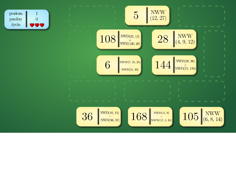 Stwórz sześć kostek domina, na których znajdą się przykłady dotyczące największego wspólnego dzielnika i najmniejszej wspólnej wielokrotności liczb naturalnych. Daj swoje domino do ułożenia koledze z klasy.