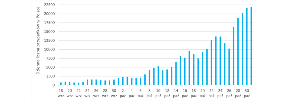 44. zestaw danych: data: 31 październik, dzienna liczba przypadków w Polsce: 22000