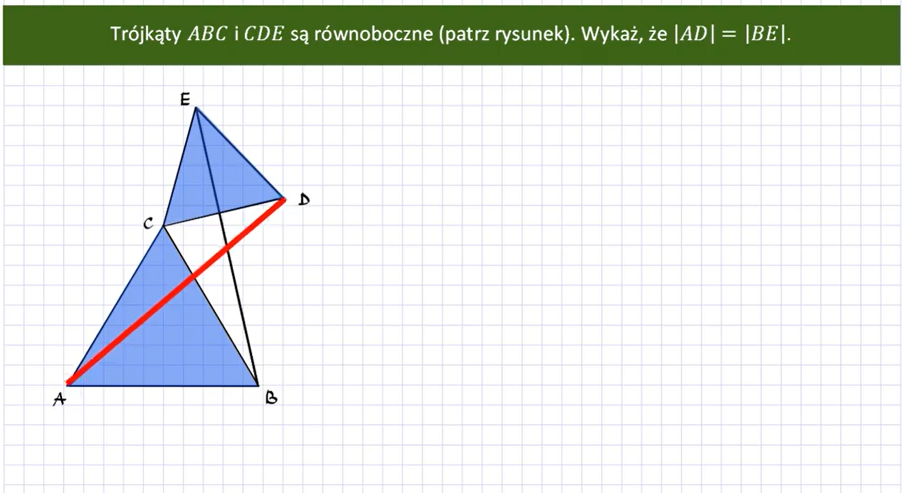 Pokażemy teraz, że ABEDBC. Przyjmijmy oznaczenie ABC=β. Wtedy ABE=β+60°. Podobnie DBC=60°+β, zatem te kąty są równe. Pozostaje zauważyć, że boki ABBE w trójkącie ABE są odpowiednio równe bokom BDBC w trójkącie DBC. Zatem na mocy cechy bkb te trójkąty są przystające. W szczególności boki AECD są równe. Co należało wykazać.