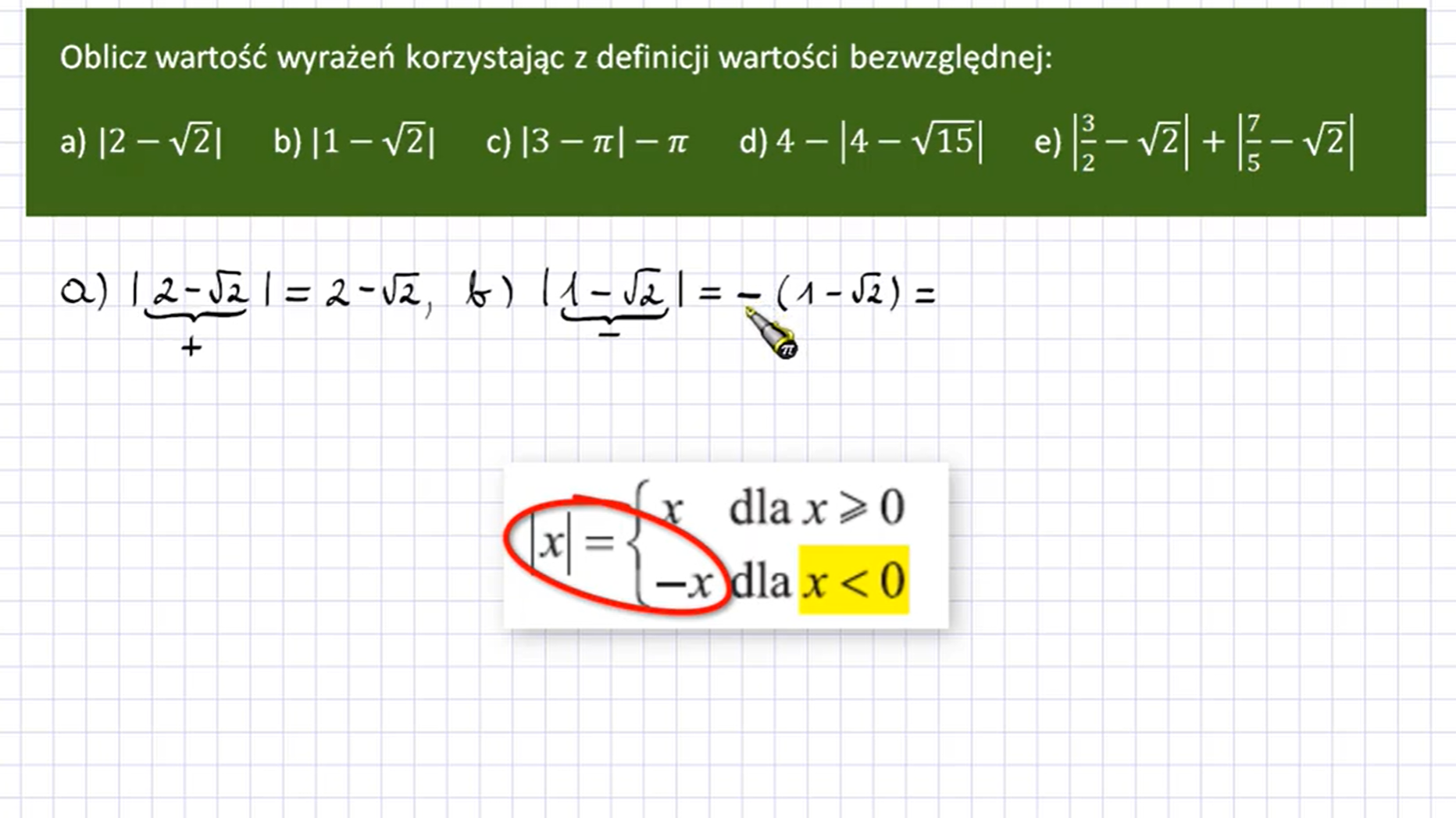 Oblicz wartość każdego z wyrażeń, korzystając z definicji wartości bezwzględnej.