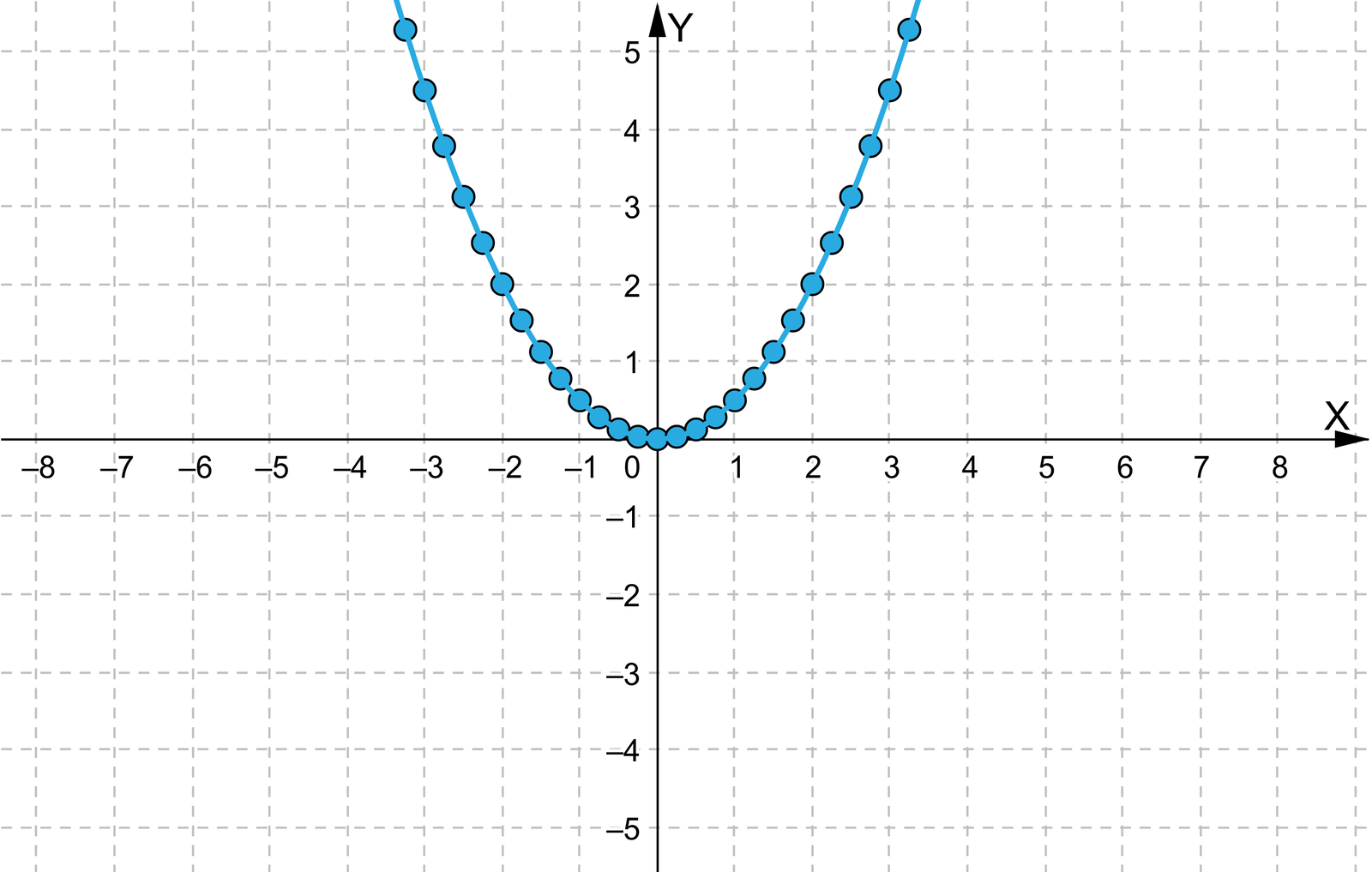Przy pomocy tabelki wyznaczyliśmy tylko niektóre wartości jednomianu kwadratowegojednomian kwadratowyjednomianu kwadratowego, a więc znaleźliśmy niektóre punkty wykresu. Ponieważ funkcja jest określona dla każdej liczby rzeczywistej, więc otrzymane punkty tworzą pewną krzywą.