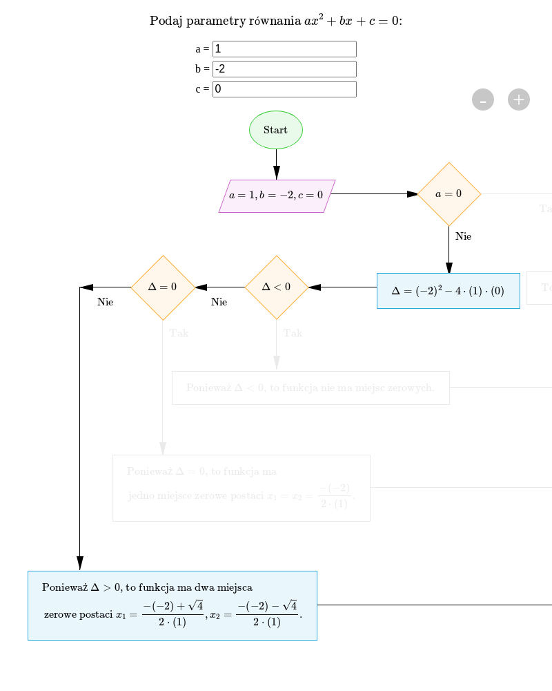Schemat. Przykład pierwszy. Start. A równa się 1, b równa się minus 2 c równa się zero. Strzałka w bok. a równa się zero. Strzałka w dół z napisem nie. DELTA, równa się, nawias, minus, dwa, zamknięcie nawiasu, indeks górny, dwa, koniec indeksu górnego, minus, cztery, razy, jeden, razy, nawias, zero, zamknięcie nawiasu. Strzałka w bok. DELTA, mniejszy niż, zero. Strzałka w bok z napisem nie. DELTA, równa się, zero. Strzałka w dół. z napisem nie. Ponieważ DELTA, większy niż, zero to funkcja ma dwa miejsca zerowe postaci x indeks dolny, jeden, koniec indeksu dolnego, równa się, początek ułamka, minus, nawias, minus, dwa, zamknięcie nawiasu, plus, pierwiastek kwadratowy z cztery koniec pierwiastka, mianownik, dwa, razy, nawias, jeden, zamknięcie nawiasu, koniec ułamka, x indeks dolny, dwa, koniec indeksu dolnego, równa się, początek ułamka, minus, nawias, minus, dwa, zamknięcie nawiasu, minus, pierwiastek kwadratowy z cztery koniec pierwiastka, mianownik, dwa, razy, nawias, jeden, zamknięcie nawiasu, koniec ułamka. Strzałka w bok. koniec. Przykład drugi. Start. A równe 0, b równe minus 2, c równe zero. Strzałka w bok. a równe zero. Strzałka w bok z napisem tak. To nie jest równanie kwadratowe. Strzałka w dół. koniec. Przykład trzeci. Start. A równe 3, b równe minus 2, c równe trzy. strzałka w bok. a równe zero. Strzałka w dół z napisem nie. DELTA, równa się, nawias, minus, dwa, zamknięcie nawiasu, indeks górny, dwa, koniec indeksu górnego, minus, cztery, razy, trzy, razy, trzy strzałka w bok. DELTA, mniejszy niż, zero. Strzałka w dół z napisem tak. Ponieważ DELTA, mniejszy niż, zero to funkcja nie ma miejsc zerowych. Strzałka w dół. koniec. Przykład czwarty. Start. A równe dwa, b równe cztery, c równe dwa. Strzałka w bok. a równe zero. Strzałka w dół z napisem nie. DELTA, równa się, nawias, cztery, zamknięcie nawiasu, indeks górny, dwa, koniec indeksu górnego, minus, cztery, razy, dwa, razy, dwa. Strzałka w bok. DELTA, mniejszy niż, zero. Strzałka w bok z napisem nie. DELTA, równa się, zero. Strzałka w dół z napisem tak. Ponieważ. DELTA, równa się, zero to funkcja ma jedno miejsce zerowe postaci x indeks dolny, jeden, koniec indeksu dolnego, równa się, x indeks dolny, dwa, koniec indeksu dolnego, równa się, początek ułamka, minus, cztery, mianownik, dwa, razy, dwa, koniec ułamka. Strzałka w dół. koniec.