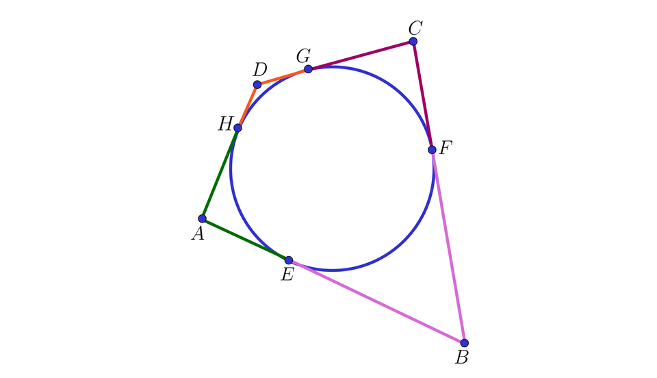 Rozważmy okrąg o środku w punkcie O i promieniu r oraz punkt P leżący na zewnątrz tego okręgu. Poprowadźmy dwie styczne do tego okręgu przechodzące przez punkt P. Punkty styczności oznaczmy AB.