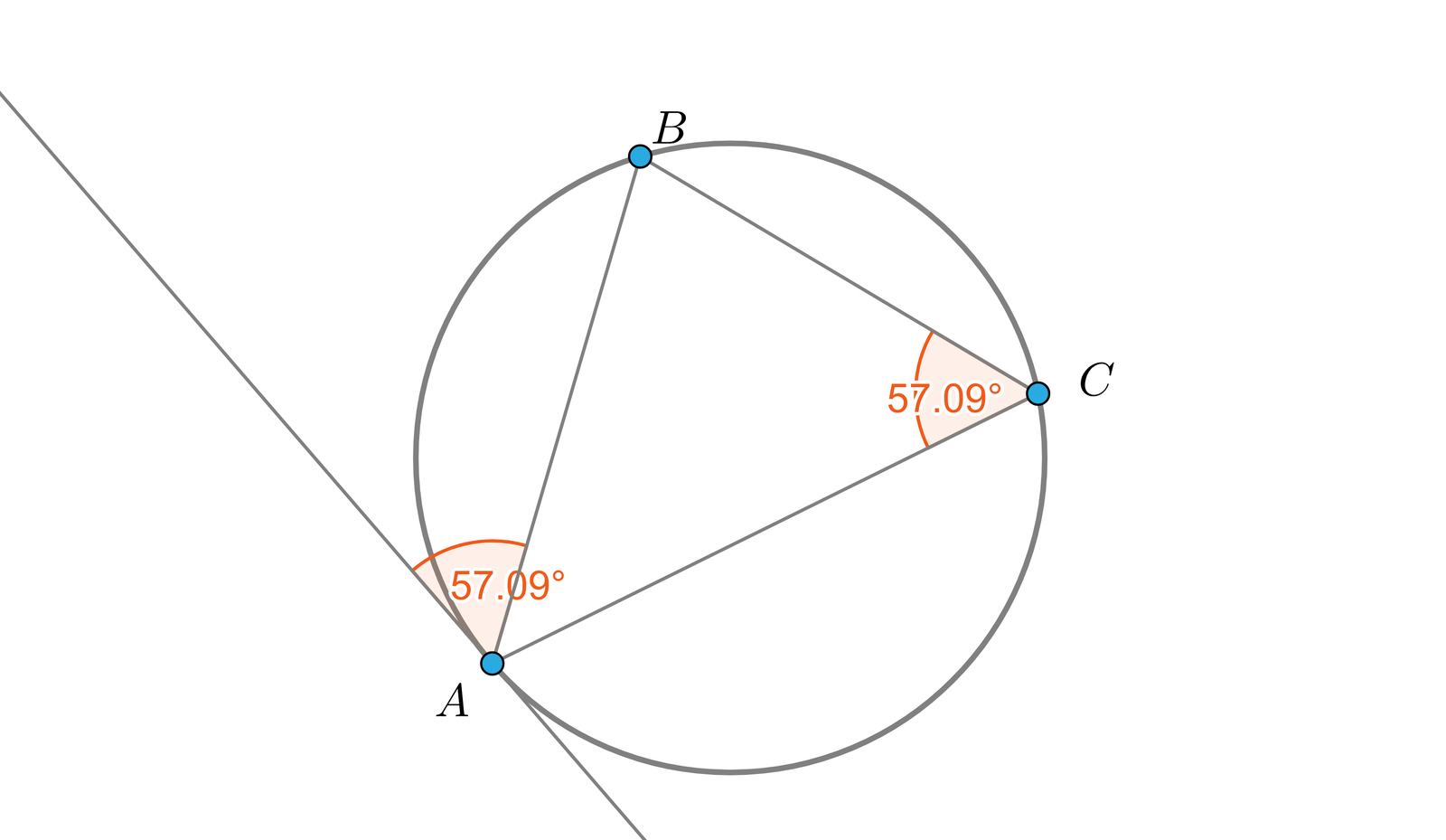 Rozważmy okrąg i dowolną jego cięciwę oraz poprowadźmy styczną przez jeden z końców tej cięciwy, jak na rysunku.