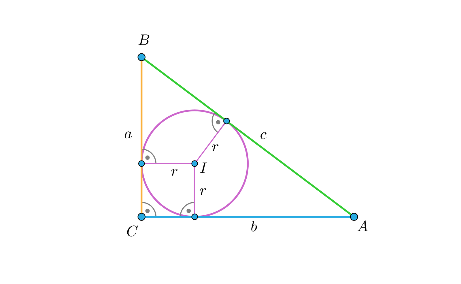 Z twierdzenia o odcinkach stycznych CE=CD, ponadto kąt przy wierzchołku C jest prosty oraz proste IEID są prostopadłe do przyprostokątnych. Zatem czworokąt CEID jest kwadratem o boku długości r. Podobnie, z twierdzenia o odcinkach stycznych otrzymujemy BF=BD=ar oraz AF=AE=br. Wiemy, że AF+FB=c, zatem: