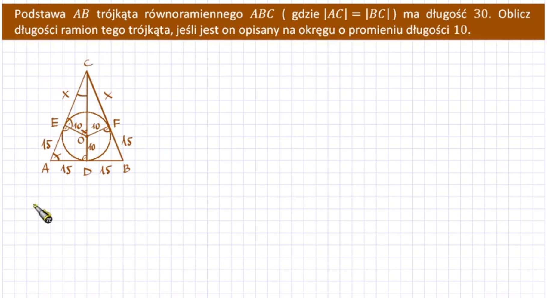 Uwaga! Gdy zauważymy, że trójkąt ICE jest podobny do „połowy” trójkąta równoramiennegotrójkąt równoramiennytrójkąta równoramiennego ABC i zapiszemy odpowiednią proporcję boków, np.:
