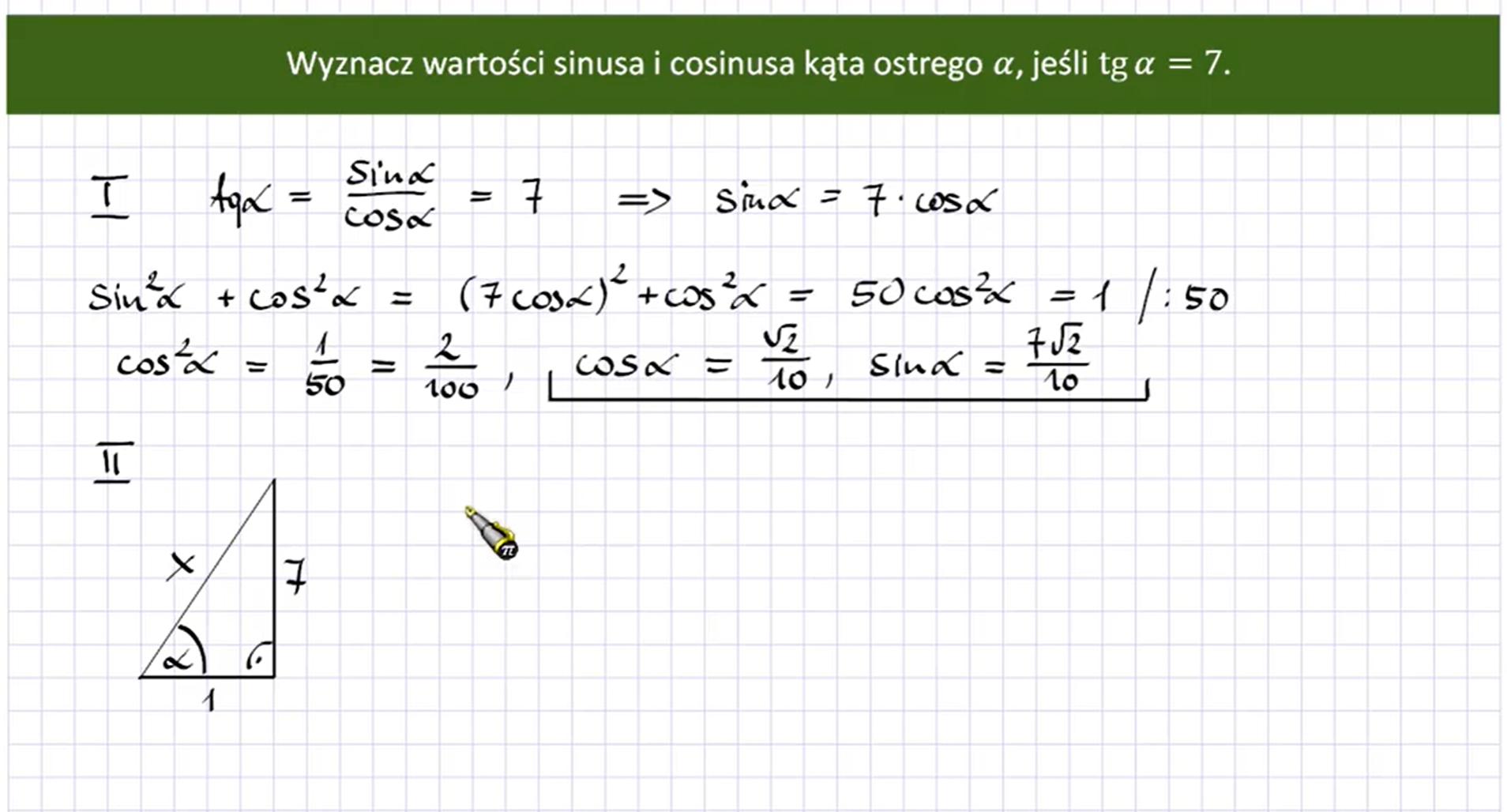 Poniżej wyznaczymy wartość sinusa kąta ostrego, gdy dany jest tangens tego kąta. Pokażemy dwie metody rozwiązywania tego typu problemów. Jeden sposób będzie opierał się na konstrukcji trójkąta prostokątnego o odpowiednich własnościach, drugi na związkach algebraicznych między funkcjami trygonometrycznymi.