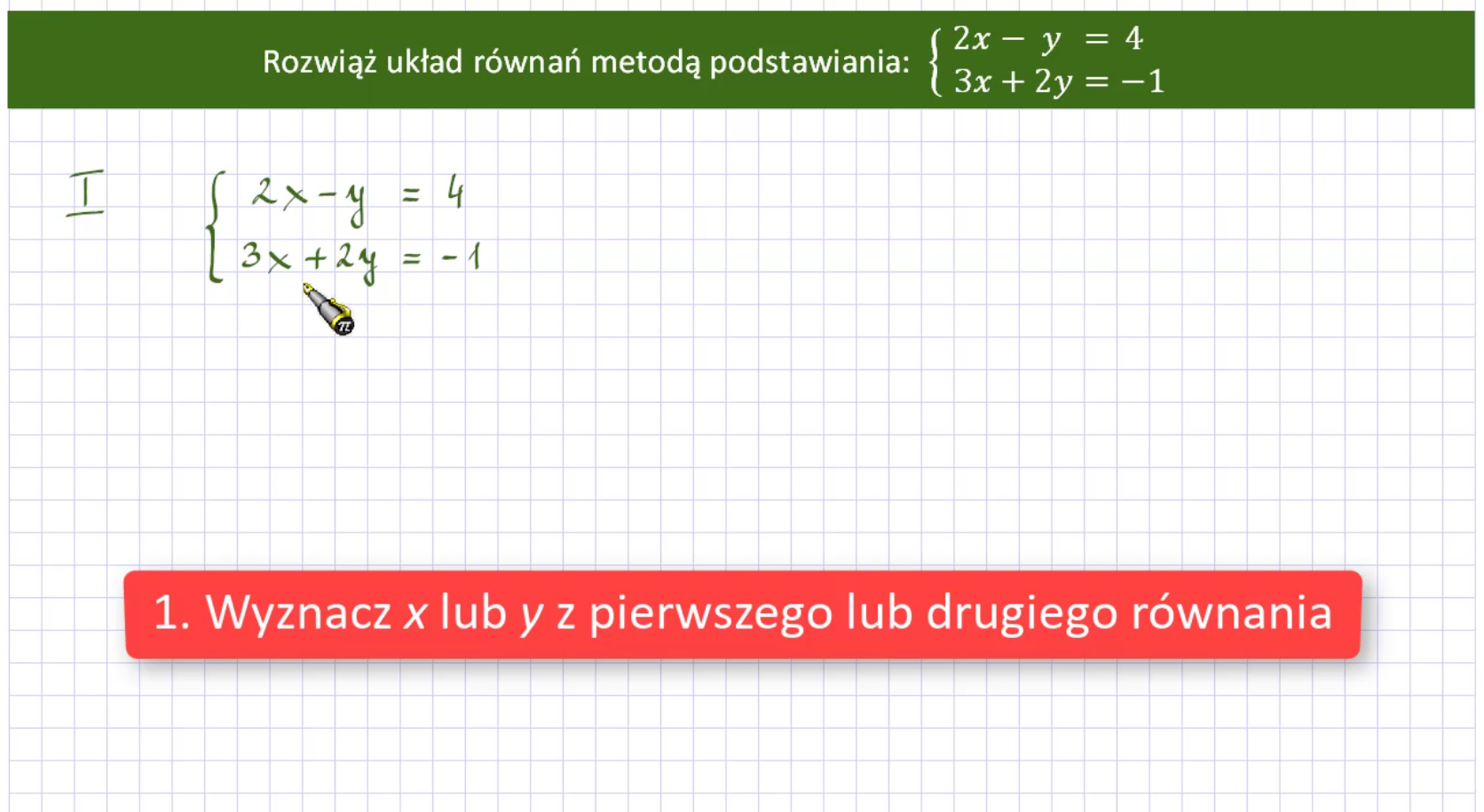 Wybieramy niewiadomą, którą możemy najłatwiej wyznaczyć. W tym układzie równań taką niewiadomą jest w drugim równaniu.