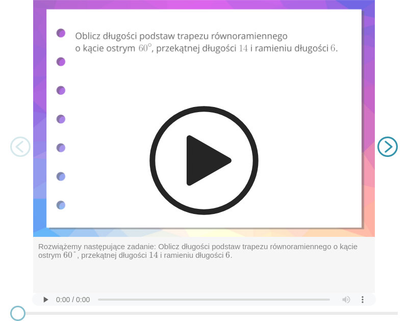 Napis. Oblicz długości podstaw trapezu równoramiennego o kącie ostrym sześćdziesiąt stopni, przekątnej długości 14 i ramieniu długości sześć. Pojawia się trapez A B C D. Dolna podstawa ma miarę a, a górna ma miarę b. Ramiona trapezu mają długość c. Przekątna trapezu została oznaczona literą d. Obok pojawiają się równości d, równa się, czternaście c, równa się, sześć W trapezie zaznaczono wysokość h. Upuszczono ją z wierzchołka C do dolnej podstawy. Powstał punkt E. Kąt przy wierzchołku C ma miarę trzydzieści stopni, a przy wierzchołku B ma miarę sześćdziesiąt stopni. Podstawę AB podzielono na dwa małe odcinki. B E o długości x oraz A E o długości y. W trójkącie CEB. Punkt pierwszy. c, równa się, dwa x, zatem x, równa się, trzy. Punkt drugi. h, równa się, x pierwiastek kwadratowy z trzy koniec pierwiastka Zatem h, równa się, trzy pierwiastek kwadratowy z trzy koniec pierwiastka. Zapisano równości. x, równa się, trzy h, równa się, trzy pierwiastek kwadratowy z trzy koniec pierwiastka. Pod spodem trójkąt C E A jest trójkątem prostokątnym, zatem h indeks górny, dwa, koniec indeksu górnego, plus, y indeks górny, dwa, koniec indeksu górnego, równa się, d indeks górny, dwa, koniec indeksu górnego W trójkącie C E A. y indeks górny, dwa, koniec indeksu górnego, plus, nawias, trzy pierwiastek kwadratowy z trzy koniec pierwiastka, zamknięcie nawiasu, indeks górny, dwa, koniec indeksu górnego, równa się, czternaście indeks górny, dwa, koniec indeksu górnego, a więc y indeks górny, dwa, koniec indeksu górnego, plus, dwadzieścia siedem indeks górny, dwa, koniec indeksu górnego, równa się, sto dziewięćdziesiąt sześć Dlatego y indeks górny, dwa, koniec indeksu górnego, równa się, sto sześćdziesiąt dziewięć, wynik końcowy to y, równa się, trzynaście Na trapezie zaznaczono wysokość upuszczoną z wierzchołka D. Powstał prostokąt o boku b oraz h. W trapezie równoramiennym dwa x, plus, b, równa się, a dwa x, równa się, a, minus, b x, równa się, początek ułamka, a, minus, b, mianownik, dwa, koniec ułamka W trapezie równoramiennym y, plus, x, równa się, a y, plus, początek ułamka, a, minus, b, mianownik, dwa, koniec ułamka, równa się, a y, równa się, początek ułamka, dwa a, minus, a, plus, b, mianownik, dwa, koniec ułamka, y, równa się, początek ułamka, a, plus, b, mianownik, dwa, koniec ułamka Zatem. nawias klamrowy, układ równań, pierwsze równanie, a, plus, b, równa się, dwadzieścia sześć, koniec równania, drugie równanie, a, minus, b, równa się, sześć, koniec równania, koniec układu równań Po zsumowaniu daje to nam dwa a, równa się, trzydzieści dwa. Po podzieleniu przez dwa daje nam to. a, równa się, szesnaście Dlatego. nawias klamrowy, układ równań, pierwsze równanie, a, równa się, szesnaście, koniec równania, drugie równanie, a, minus, b, równa się, sześć, koniec równania, koniec układu równań, nawias klamrowy, układ równań, pierwsze równanie, a, równa się, szesnaście, koniec równania, drugie równanie, szesnaście, minus, b, równa się, sześć, koniec równania, koniec układu równań, nawias klamrowy, układ równań, pierwsze równanie, a, równa się, szesnaście, koniec równania, drugie równanie, b, równa się, dziesięć, koniec równania, koniec układu równań Odpowiedź. Dlatego długości podstaw trapezu wynoszą 16 i dziesięć.