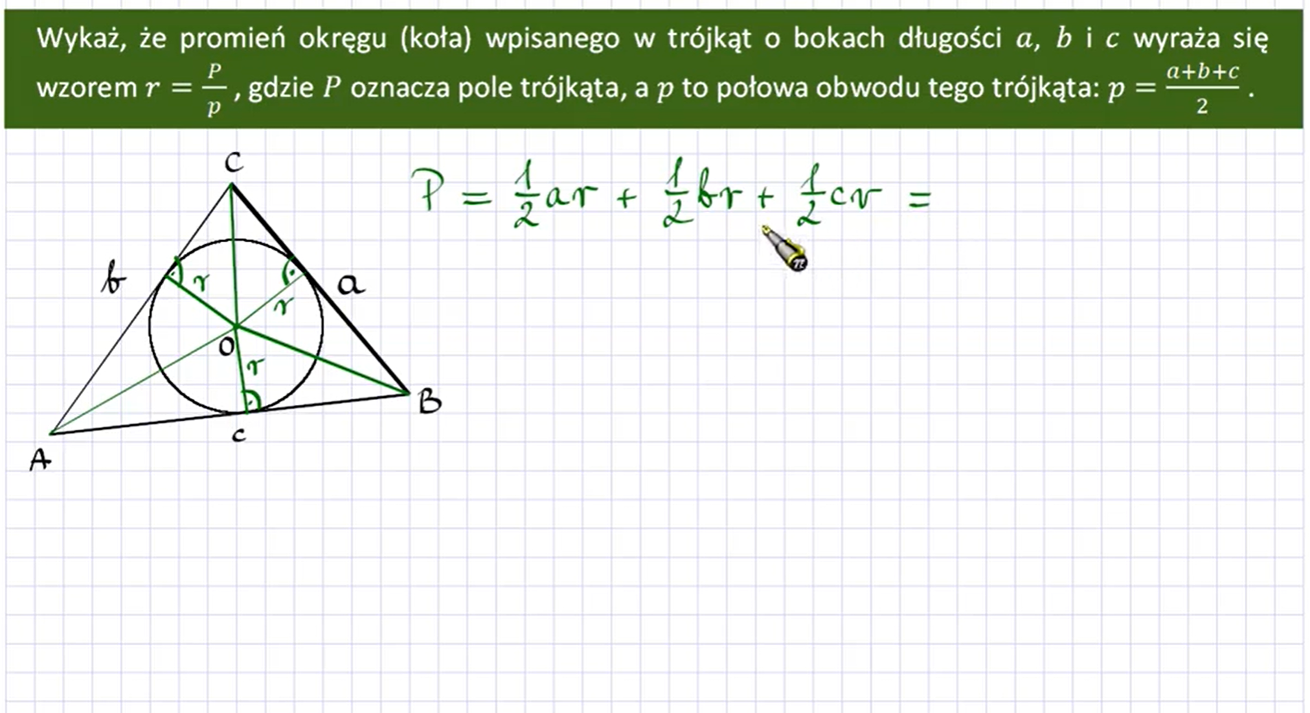 Jeżeli w trójkącie ABC poprowadzimy odcinki łączące wierzchołki ze środkiem okręgu wpisanego w ten trójkąt, to otrzymamy trzy mniejsze trójkąty: ABO, BCO, CAO. Łatwo zauważyć, że wysokość każdego z nich jest równa długości promienia okręgu wpisanego w ten trójkąt. Sumując pola trzech powstałych trójkątów, otrzymujemy pole trójkąta ABC: