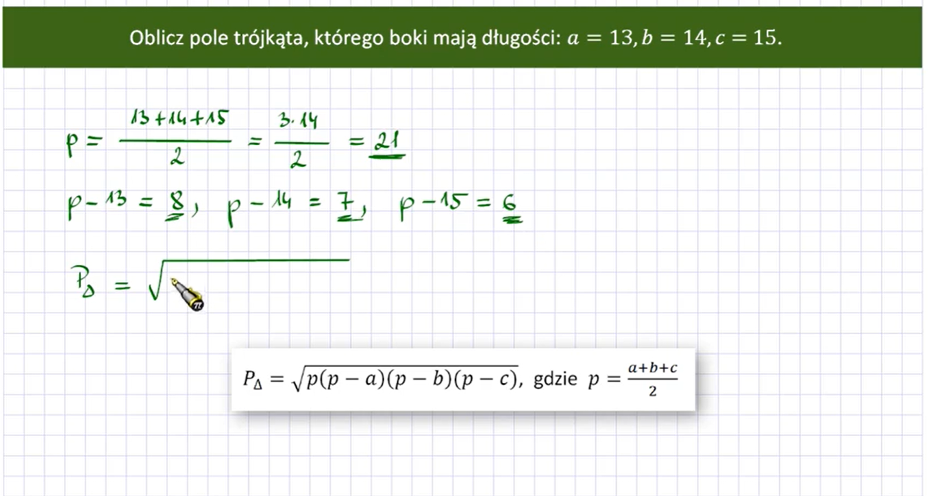 Obliczmy pole trójkąta, którego boki mają długości , , .