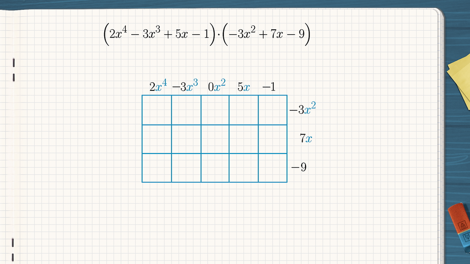 W kolejnym przykładzie zaprezentujemy metodę obliczenia iloczynu wielomianów z pomocą tabelki. Jest przydatna zwłaszcza w sytuacji, gdy mnożone wielomiany zawierają więcej składników.