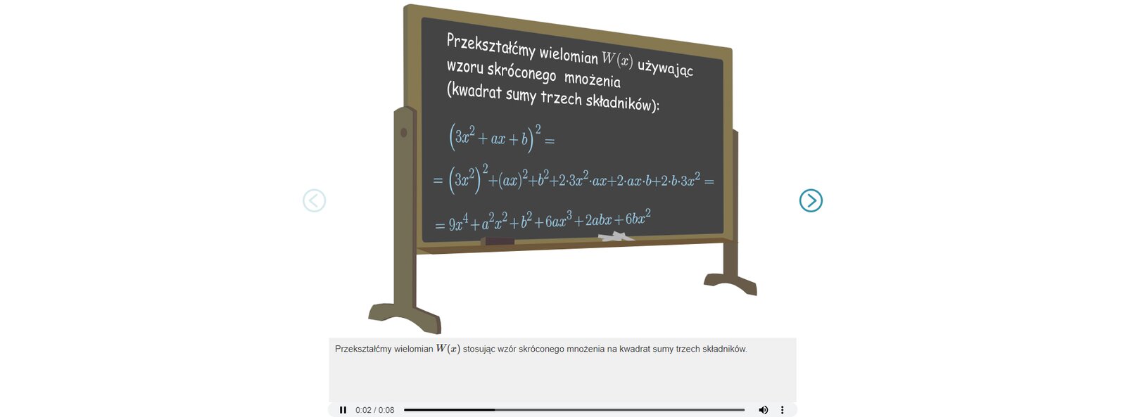 Przekształćmy wielomian W od x, używając wzoru skróconego mnożenia na kwadrat sumy trzech składników. Rozwiązanie: nawias, trzy x indeks górny, dwa, koniec indeksu górnego, plus, a x, plus, b, zamknięcie nawiasu, indeks górny, dwa, koniec indeksu górnego, równa się, nawias, trzy x indeks górny, dwa, koniec indeksu górnego, zamknięcie nawiasu, indeks górny, dwa, koniec indeksu górnego, plus, nawias, a x, zamknięcie nawiasu, indeks górny, dwa, koniec indeksu górnego, plus, b indeks górny, dwa, koniec indeksu górnego, plus, dwa, razy, trzy x indeks górny, dwa, koniec indeksu górnego, razy, a x, plus, dwa, razy, a x, razy, b, plus, dwa, razy, b, razy, trzy x indeks górny, dwa, koniec indeksu górnego, równa się Po redukcji wyrazów podobnych otrzymujemy: równa się, dziewięć x indeks górny, cztery, koniec indeksu górnego, plus, a indeks górny, dwa, koniec indeksu górnego, x indeks górny, dwa, koniec indeksu górnego, plus, b indeks górny, dwa, koniec indeksu górnego, plus, sześć a x indeks górny, trzy, koniec indeksu górnego, plus, dwa a b x, plus, sześć b x indeks górny, dwa, koniec indeksu górnego. Po pogrupowaniu otrzymujemy wielomian czwartego stopnia. W nawias, x, zamknięcie nawiasu, równa się, dziewięć x indeks górny, cztery, koniec indeksu górnego, plus, sześć a x indeks górny, trzy, koniec indeksu górnego, plus, nawias, a indeks górny, dwa, koniec indeksu górnego, plus, sześć b, zamknięcie nawiasu, x indeks górny, dwa, koniec indeksu górnego, plus, dwa a b x, plus, b indeks górny, dwa, koniec indeksu górnego. Mamy porównać dwa wielomiany czwartego stopnia. Zapiszmy ich wzory uporządkowane w kolejności malejących wykładników potęg przy niewiadomej. Wielomian pierwszy W nawias, x, zamknięcie nawiasu, równa się, dziewięć x indeks górny, cztery, koniec indeksu górnego, plus, sześć a x indeks górny, trzy, koniec indeksu górnego, plus, nawias, a indeks górny, dwa, koniec indeksu górnego, plus, sześć b, zamknięcie nawiasu, x indeks górny, dwa, koniec indeksu górnego, plus, dwa a b x, plus, b indeks górny, dwa, koniec indeksu górnego i wielomian drugi: P nawias, x, zamknięcie nawiasu, równa się, dziewięć x indeks górny, cztery, koniec indeksu górnego, plus, dwanaście x indeks górny, trzy, koniec indeksu górnego, plus, c x indeks górny, dwa, koniec indeksu górnego, plus, d x, plus, dwadzieścia pięć. Porównując współczynniki przy kolejnych potęgach niewiadomej uzyskujemy układ czterech równań z czterema niewiadomymi. Układ równań jest następujący. nawias klamrowy, układ równań, pierwsze równanie, sześć a, równa się, dwanaście, koniec równania, drugie równanie, a indeks górny, dwa, koniec indeksu górnego, plus, sześć b, równa się, c, koniec równania, trzecie równanie, dwa a b, równa się, d, koniec równania, czwarte równanie, b indeks górny, dwa, koniec indeksu górnego, równa się, dwadzieścia pięć, koniec równania, koniec układu równań Z pierwszego równania wyznaczamy a, które jest równe dwa. Z czwartego równania mamy, że jest równe pięć lub minus pięć. Mamy więc do rozważenia dwa przypadki. Przypadek pierwszy: nawias klamrowy, układ równań, pierwsze równanie, a, równa się, dwa, koniec równania, drugie równanie, b, równa się, pięć, koniec równania, trzecie równanie, c, równa się, a indeks górny, dwa, koniec indeksu górnego, plus, sześć b, koniec równania, czwarte równanie, d, równa się, dwa a b, koniec równania, koniec układu równań przypadek drugi: nawias klamrowy, układ równań, pierwsze równanie, a, równa się, dwa, koniec równania, drugie równanie, b, równa się, minus, pięć, koniec równania, trzecie równanie, c, równa się, a indeks górny, dwa, koniec indeksu górnego, plus, sześć b, koniec równania, czwarte równanie, d, równa się, dwa a b, koniec równania, koniec układu równań Zatem mamy: nawias klamrowy, układ równań, pierwsze równanie, a, równa się, dwa, koniec równania, drugie równanie, b, równa się, pięć, koniec równania, trzecie równanie, c, równa się, trzydzieści cztery, koniec równania, czwarte równanie, d, równa się, dwa a b, koniec równania, koniec układu równań lub nawias klamrowy, układ równań, pierwsze równanie, a, równa się, dwa, koniec równania, drugie równanie, b, równa się, minus, pięć, koniec równania, trzecie równanie, c, równa się, cztery, minus, trzydzieści, równa się, minus, dwadzieścia sześć, koniec równania, czwarte równanie, d, równa się, dwa a b, koniec równania, koniec układu równań. Pozostało obliczyć wartość ostatniego parametru. Mamy więc nawias klamrowy, układ równań, pierwsze równanie, a, równa się, dwa, koniec równania, drugie równanie, b, równa się, pięć, koniec równania, trzecie równanie, c, równa się, trzydzieści cztery, koniec równania, czwarte równanie, d, równa się, dwa, razy, dziesięć, równa się, dwadzieścia, koniec równania, koniec układu równań lub nawias klamrowy, układ równań, pierwsze równanie, a, równa się, dwa, koniec równania, drugie równanie, b, równa się, minus, pięć, koniec równania, trzecie równanie, c, równa się, minus, dwadzieścia sześć, koniec równania, czwarte równanie, d, równa się, dwa, razy, nawias, minus, dziesięć, zamknięcie nawiasu, równa się, minus, dwadzieścia, koniec równania, koniec układu równań. Zadanie ma zatem dwa rozwiązania: nawias klamrowy, układ równań, pierwsze równanie, a, równa się, dwa, koniec równania, drugie równanie, b, równa się, pięć, koniec równania, trzecie równanie, c, równa się, trzydzieści, koniec równania, czwarte równanie, d, równa się, dwadzieścia, koniec równania, koniec układu równań lub nawias klamrowy, układ równań, pierwsze równanie, a, równa się, dwa, koniec równania, drugie równanie, b, równa się, minus, pięć, koniec 