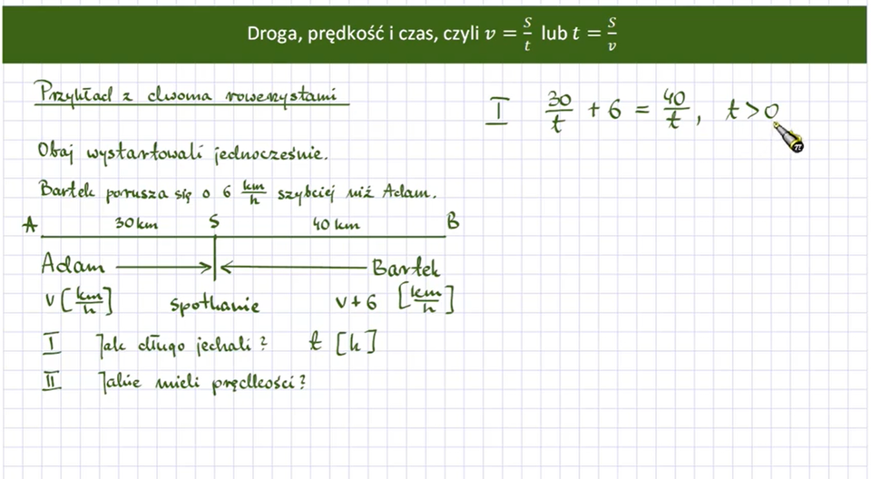 Ponieważ czas przejazdu w obu przypadkach jest taki sam, zatem do obliczenia prędkości v rozwiązujemy równanie: