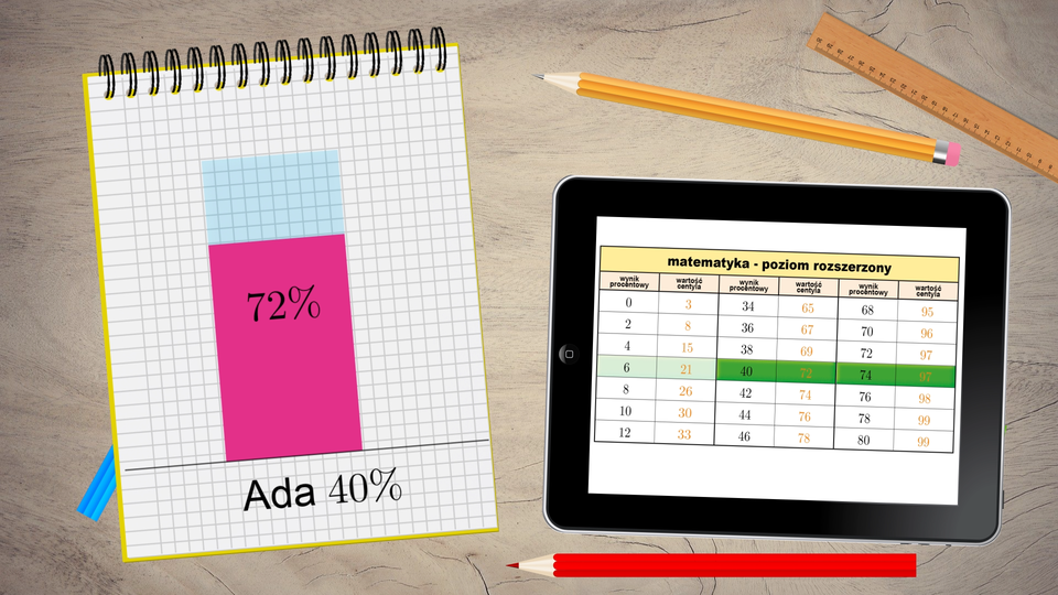 Na środku ekranu pojawia się napis centyl. Napis znika, a na ekranie pojawia się dokument świadectwa dojrzałości Jana Kowalskiego na tle rozsypanych na stole kredek i ołówków. Dokument zawiera wyniki z części ustnej: języka polskiego i języka angielskiego, oraz części pisemnej: języka polskiego i języka angielskiego. Wyniki są zaprezentowane w postaci procentowej zmieniają się. Obok świadectw pojawia się tablet. Na tablecie pojawia się wykres rosnący wykładniczo. Na poziomej osi X są zaznaczone punkty: dziesięć, dwadzieścia, trzydzieści, czterdzieści, pięćdziesiąt, sześćdziesiąt, siedemdziesiąt, osiemdziesiąt, dziewięćdziesiąt, sto. Na osi pionowej są zaznaczone punkty: dwadzieścia pięć, pięćdziesiąt, siedemdziesiąt pięć, sto. Punkty na osiach X i Y stanowią podstawę do wyrysowania siatki na wykresie. Oprócz głównego wykresu na wykresie pojawiają się dodatkowe wykresy, przesunięte w stosunku do głównego wykresu nieznacznie w górę lub w dół. Świadectwo dojrzałości znika, ekran tabletu rozszerza się na większość ekranu. Ekran tabletu jest czysty. Na środku ekranu tabletu pojawia się napis Zuza siedemdziesiąt dziewięć procent. Napis przesuwa się do dołu tabletu, a nad nim pojawia się słupek wykresu. Większa, dolna część słupka jest wydzielona i oznaczona jako siedemdziesiąt dziewięć procent. Pozostała cześć słupka u góry oznaczona jest jako 21%. Ekran tabletu jest wyczyszczony, pojawia się na nim tabela wyników z matematyki poziom rozszerzony. Tabela zawiera wyniki procentowe i odpowiadające im wartości centyla w trzech pionowych kolumnach. Zaznaczony jest rząd tabeli zawierający wynik procentowy sześć i wartość centyla dwadzieścia jeden, wynik procentowy czterdzieści i wartość centyla siedemdziesiąt dwa, oraz wynik procentowy siedemdziesiąt cztery i wartość centyla dziewięćdziesiąt siedem. Obraz tabletu zmniejsza się, i przesuwa na lewą stronę ekranu. Po prawej stronie pojawia się kartka papieru w kratkę. Na dole kartki papieru pojawia się napis Julek siedemdziesiąt cztery procent. Nad napisem pojawia się słupek wykresu. Prawie cały słupek, od dołu prawie do samej góry słupka, jest zaznaczony i opisany jako dziewięćdziesiąt siedem procent. Pozostała, górna cześć słupka oznaczona jest jako trzy procent. Kartka jest wyczyszczona. Na dole kartki papieru pojawia się napis Ada czterdzieści procent. Nad napisem pojawia się słupek wykresu. Prawie trzy czwarte słupka od dołu jest zaznaczone i opisany jako siedemdziesiąt dwa procent. Pozostała, górna cześć słupka oznaczona jest jako dwadzieścia osiem procent. Tablet powiększa się, zajmuje prawie całą powierzchnię ekranu. Na tablecie pojawia wykres wyników egzaminu w postaci słupków. Oś pozioma X to rosnąca skala centylowa z zaznaczonymi punktami sześćdziesiąt, sześćdziesiąt pięć, siedemdziesiąt, siedemdziesiąt pięć, osiemdziesiąt, osiemdziesiąt pięć, dziewięćdziesiąt. Oś pionowa to liczba uczniów, z zaznaczonymi poziomami zero, jeden, dwa, trzy, cztery, pięć i sześć. Jeden słupek znajduje się na osi X w punkcie sześćdziesiąt, i osiąga wysokość pięć. Kolejny znajduje się w punkcie siedemdziesiąt pięć , i osiąga wysokość cztery. Ostatni znajduje się w punkcie osiemdziesiąt pięć, i osiąga wysokość jeden.