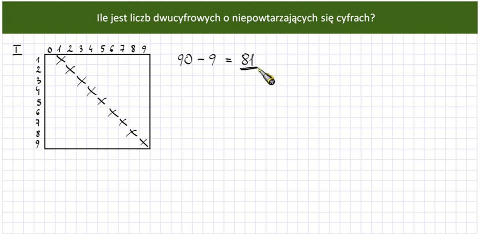 Film pokazuje różne metody wykorzystania wariacji bez powtórzeń do obliczania liczby liczb spełniających określone warunki.