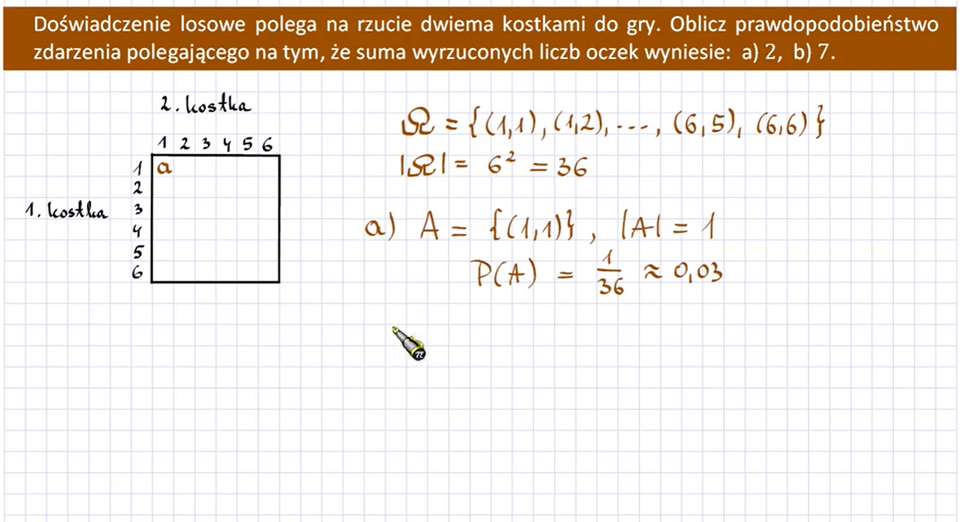 W tym materiale również rozwiążemy takie zadania, skorzystamy przy tym z klasycznej definicji prawdopodobieństwa. Klasyczne definicja prawdopodobieństwa obejmuje tylko przypadki, gdy rozważane zdarzenia są jednakowo prawdopodobne i jest ich skończona liczba. Takie założenie przyjmowano automatycznie w początkach rozwoju rachunku prawdopodobieństwa, niestety często prowadziło to do błędnych rozwiązań. Sytuacje oparte na założeniach klasycznej definicji prawdopodobieństwa rzadko występują w realnym świecie. Jednak ich rozważanie rozwija umiejętność logicznego myślenia i jest bazą do prowadzenia bardziej złożonych operacji matematycznych, np. w obliczeniach statystycznych.