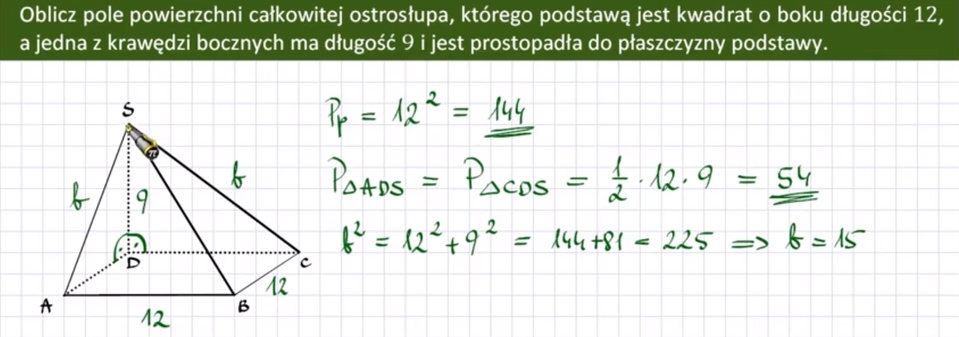 Powyższy przykład jest potwierdzeniem wniosku mówiącego, że wystarczy zsumować pole podstawy oraz pola ścian bocznych, aby uzyskać pole powierzchni całkowitej ostrosłupa.