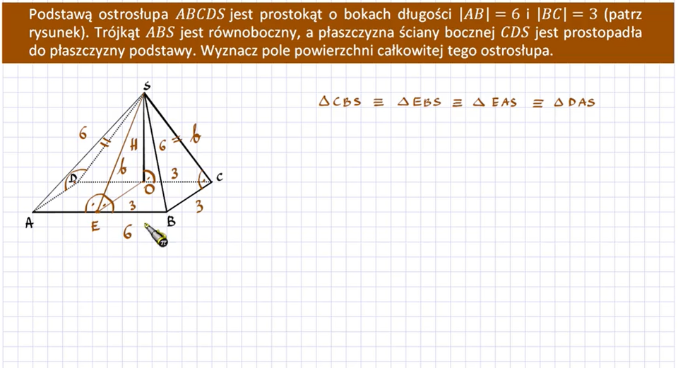 Zauważmy, że , ponieważ ostrosłup jest prosty. Oznaczmy .