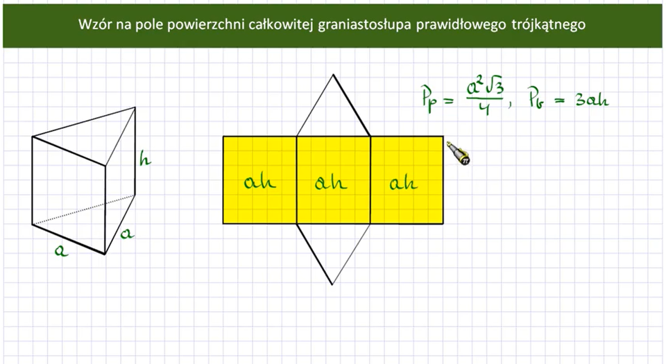 Film nawiązujący do treści materiału dotyczącej pola powierzchni graniastosłupa prawidłowego trójkątnego.