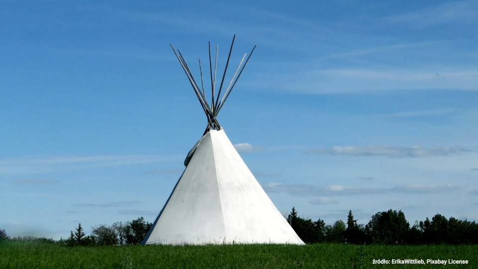 Wigwam o wysokości 6 m, w kształcie ostrosłupa prawidłowego sześciokątnego, pokryto gontem bitumicznym.