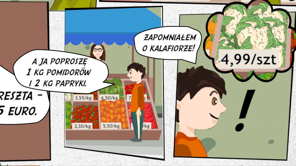 Pierwszy klient kupił pomidorów i marchwi oraz kalafior. Podał sprzedawcy banknot o nominale dwadzieścia euro. Kolejna osoba poprosiła o papryki oraz pomidorów. Otrzymała 6, euro reszty. Tomek kupił o jeden kilogram mniej pomidorów niż pierwszy klient i pięć razy mniej kilogramów papryki niż druga osoba. O kalafiorze zapomniał.