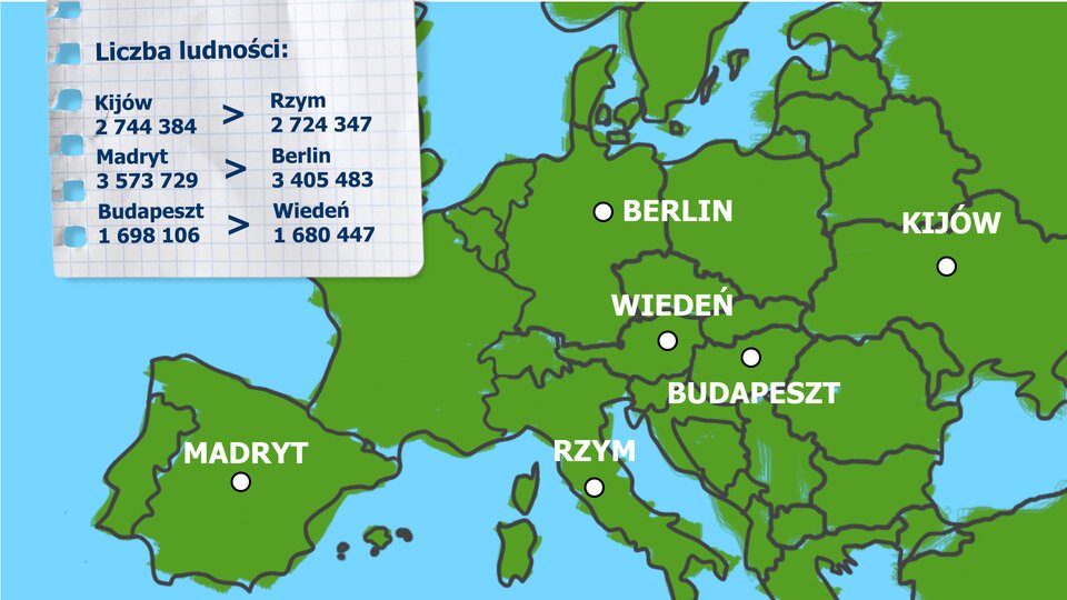 W tabeli zapisano w kolejności malejącej liczby mieszkańców wybranych stolic europejskich. Z zestawienia wynika, że najwięcej ludzi mieszka w Moskwie.
