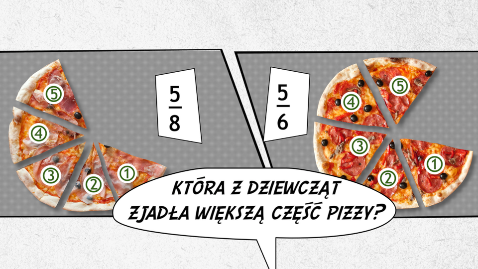 Animacja przedstawia w jaki sposób możemy porównywać ułamki zwykłe o takich samych mianownikach na przykładzie pizzy.