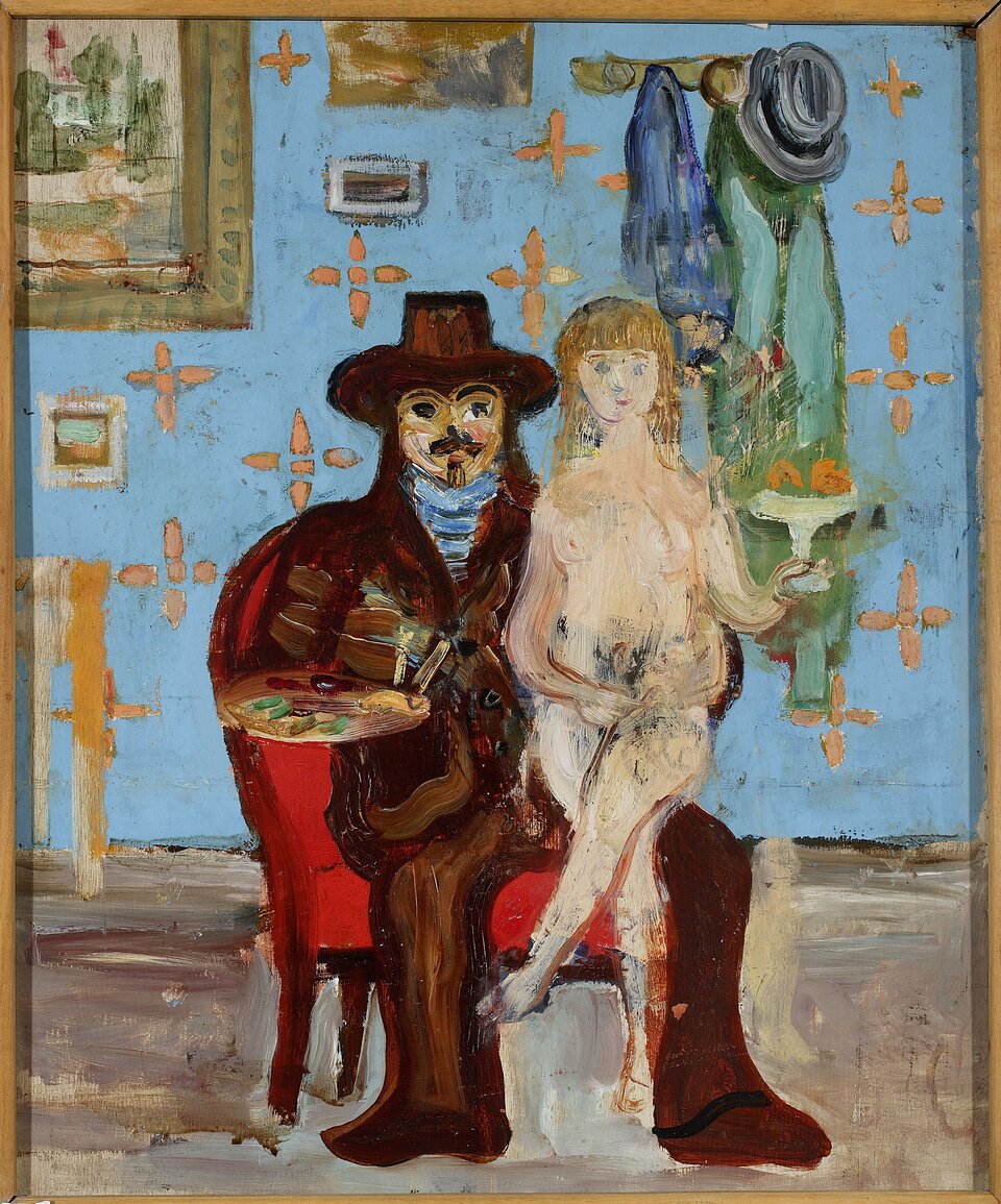 Obraz Malarz i modelka z 1930 roku ukazuje charakterystyczny dla Waliszewskiego sposób upraszczania form i budowania sceny poprzez wyraziste, lecz niekrzykliwe barwy. W centrum kompozycji, na czerwonym fotelu, siedzi malarz w garniturze i kapeluszu, trzymający w dłoni paletę, a na jego kolanach z prawej strony przysiada naga modelka. Tło z tapetą, wieszakiem i zawieszonymi obrazami buduje atmosferę prywatnego, nieco zagraconego wnętrza. Waliszewski operuje wyrazistymi barwami, pozbawionymi jednak jaskrawości, a zarazem budujących ekspresję dzieła, którą dodatkowo wzmacnia wyrazista faktura. Mimo to zachowuje syntetyczność plamy barwnej - niebieskiej ściany z tapetowym wzorem oraz kontrastującej z nią czerwieni fotela.